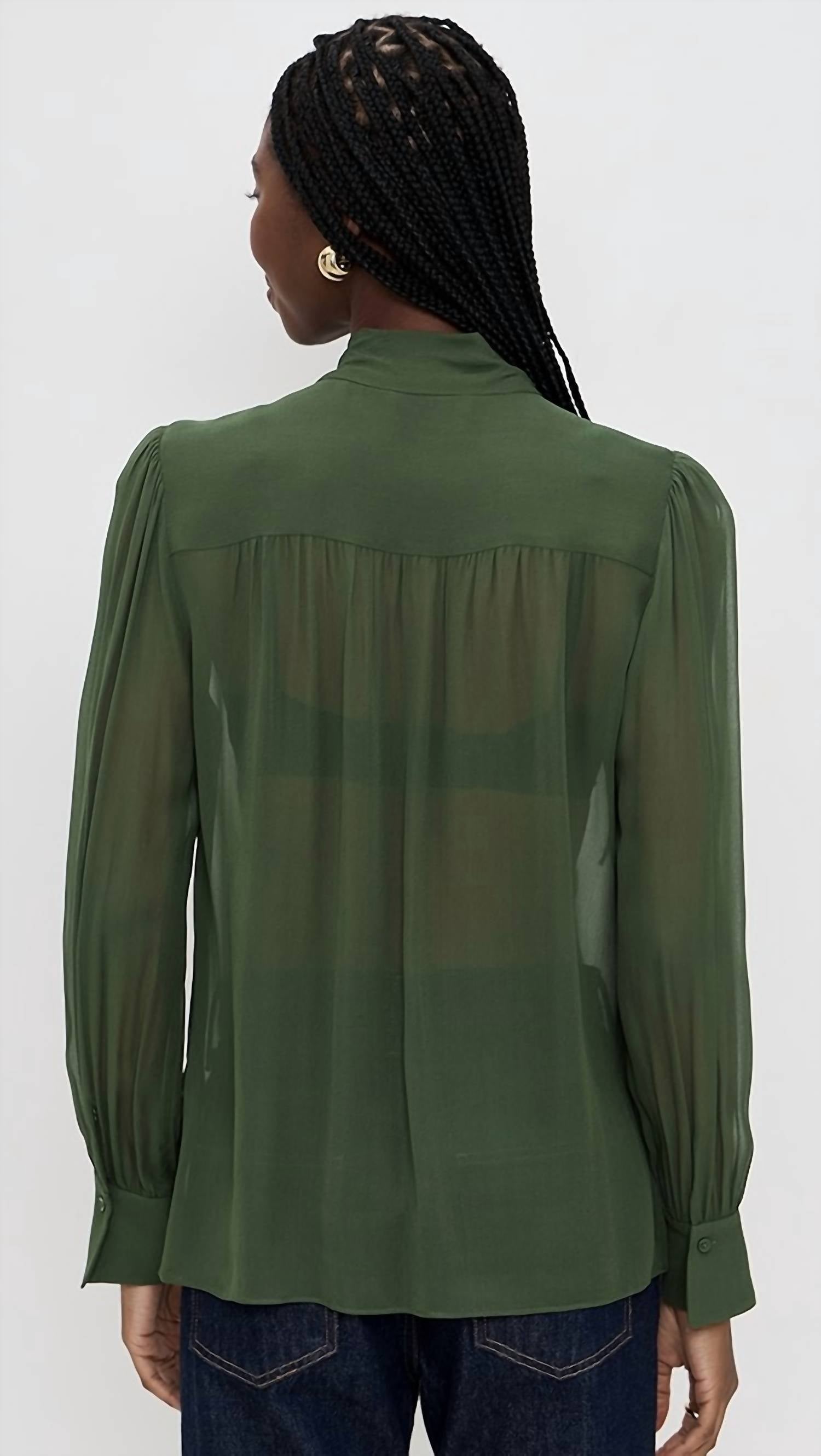 A timeless blouse that will never go out of style. Introducing the Thayer Tie Neck Slouchy Blouse by alice + olivia, a chic option for any wardrobe. This blouse has long sleeves with button cuffs and a stylish tie at the neckline with a covered button placket. Made from 100% lightweight, non-stretch viscose chiffon, it's perfect for summer occasions. Care for this solid, dark olive piece by dry cleaning it to maintain its sleek look.