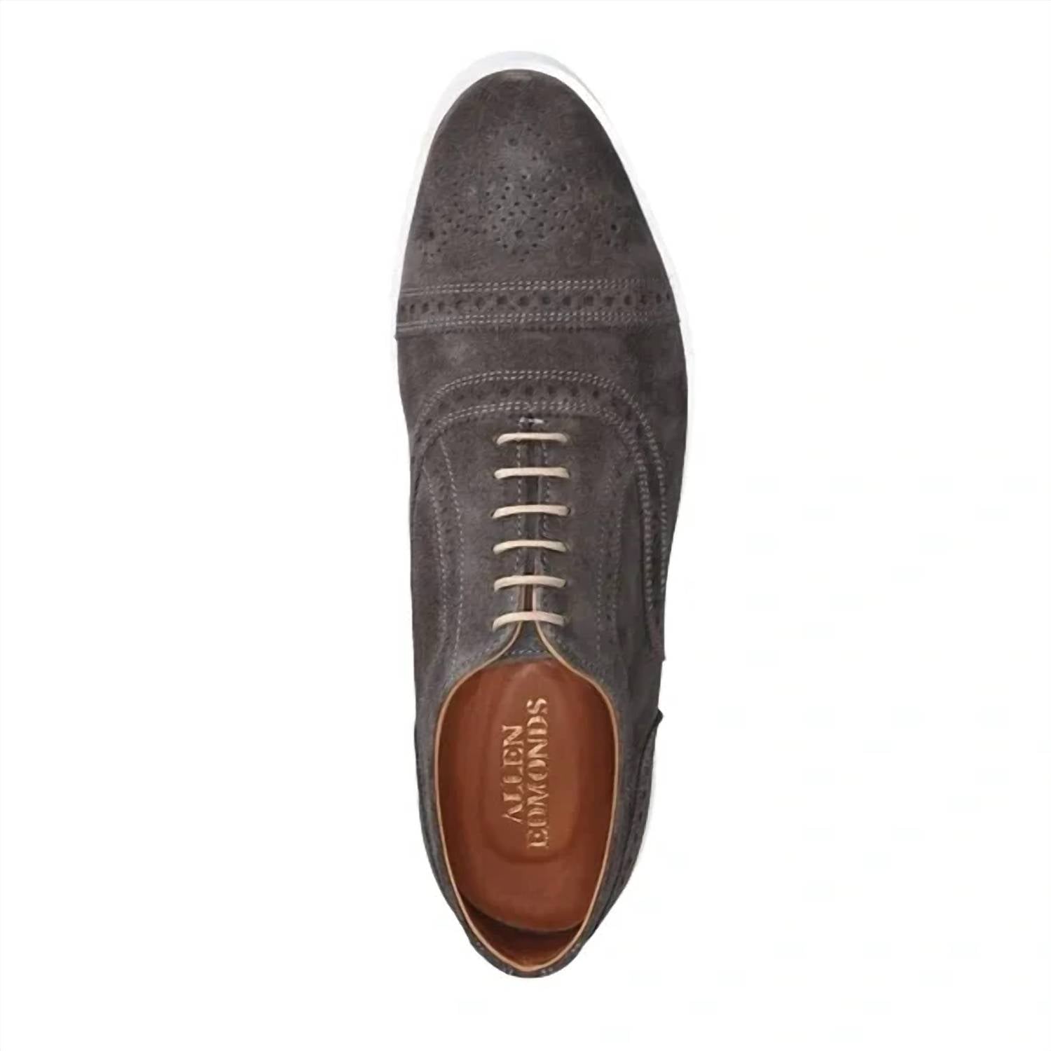 Discover the Men's Strand Cap Toe Oxford Sneaker by Allen Edmonds, where timeless sophistication meets modern comfort. This preppy, almond toe sneaker in gray features a flexible rubber cup sole and a soft, leather-lined interior, making it perfect for spring dinner parties. It includes removable FlyForm™ insoles for enhanced comfort and support. This smart and versatile footwear option showcases Allen Edmonds' commitment to style and quality.