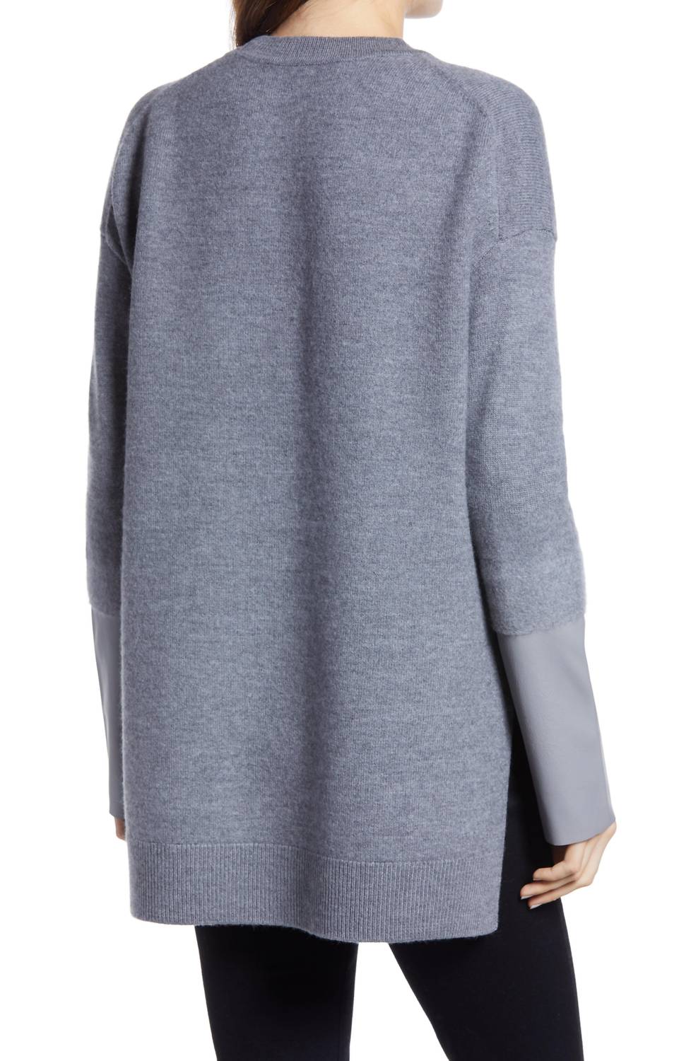Stay warm and stylish in this versatile and effortlessly cool knitwear staple. Wear it alone or layered, it's the perfect sweater for the season and you'll wish you had it in every color. Wrap yourself in the AllSaints Essy Leather Cuff Wool Sweater Tunic, a Gray oversized sweater that combines relaxed coziness with a sleek edge. This garment features long sleeves with genuine leather cuffs and is crafted from 100% merino wool with leather contrast, ensuring both comfort and luxury. The tunic is designed with a crewneck and long sleeves, complemented by a ribbed hem and side slits measuring 10" for added style and movement. With a length of 30", shoulder width of 24.5", chest of 23", and sleeve length of 19.5", it calls for professional leather cleaning to maintain its edgy appeal.