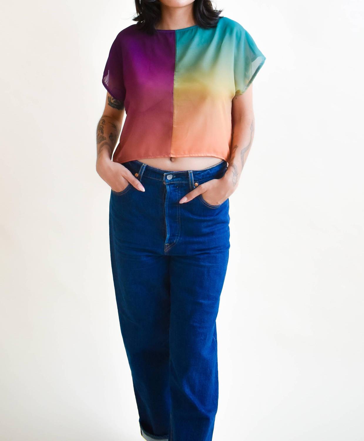 Show a little skin in this cute and casual crop top. Introducing the Ooak Fox Crop Top by Altar, a stylish nod to 90s fashion with its multicolor pattern and eco-friendly design. Featuring short sleeves and a comfortable pull-on closure, this boxy crop top is crafted from deadstock polyester and showcases a unique patterned design. Handmade in Portland, OR, each piece is a testament to sustainable fashion, utilizing zero-waste techniques and remnant fabrics. Perfect for travel or layering over your favorite high-waisted pieces, this top combines effortless style with ethical production.