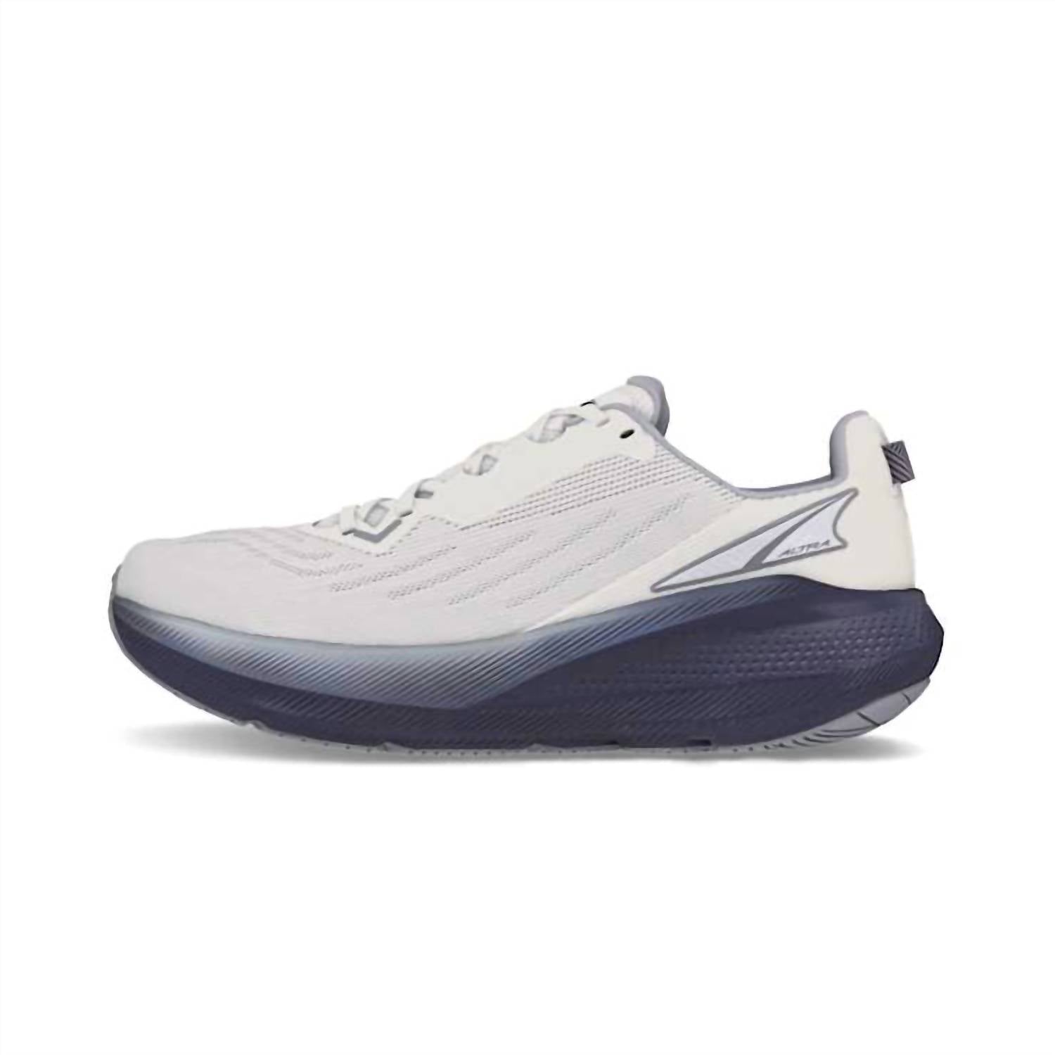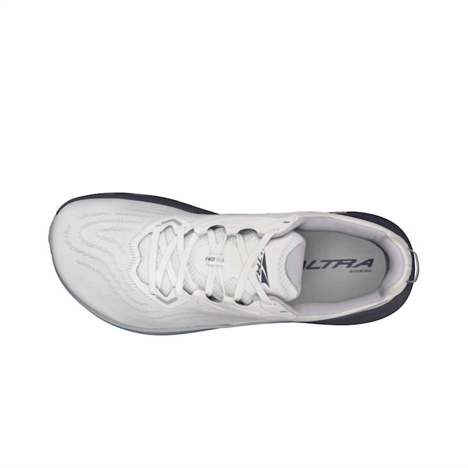 Experience the pinnacle of road running with the Altra Men's Fwd Via Running Shoes in a sleek White/Navy design. Featuring an engineered spacer mesh upper for enhanced breathability, these shoes are built with Altra EGO™ FLO nitrogen-infused midsole foam for a lightweight and responsive feel. Enjoy a low 4mm drop and rocker shape geometry that promotes an efficient toe-off, coupled with Altra’s signature FootShape fit providing a roomy toe box. Perfect for fitness workouts and summer athleisure, these shoes offer unparalleled comfort and mobility.