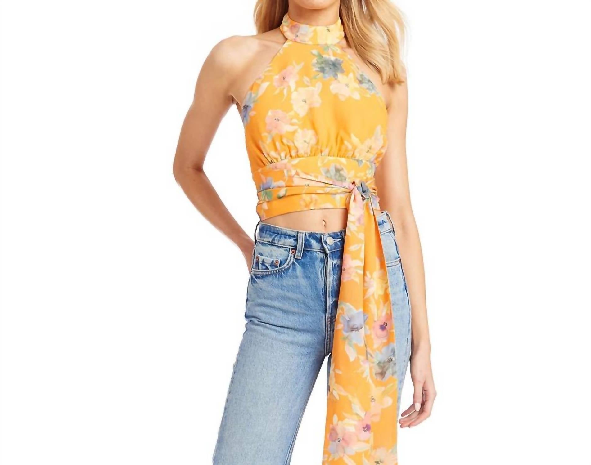Show a little skin in this cute and casual crop top. The Aurelie Halter Top by Amanda Uprichard in Havana is a vibrant and stylish piece perfect for warm weather. It features a high halter neckline with an open back, creating a chic and airy look. The adjustable waist tie allows for a customized fit that flatters the silhouette. Made from 100% polyester, the top is lightweight and comfortable, with a lively floral pattern in warm tones. Designed for dry cleaning, it pairs well with high-waisted jeans or skirts for a casual yet elegant outfit.