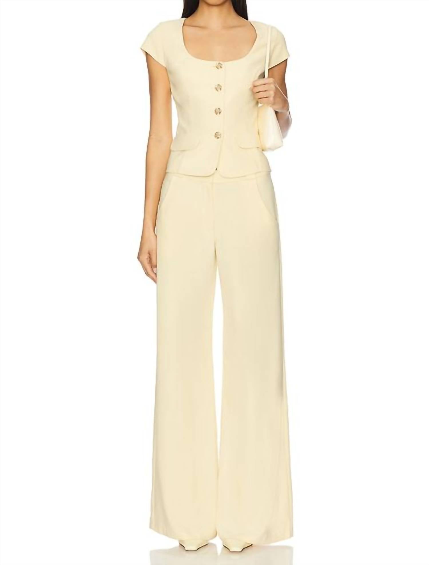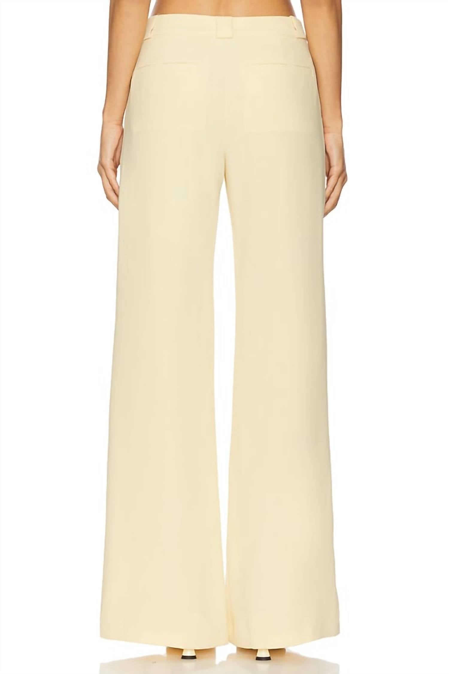 Introducing the Saddler Wide Leg Pants by Amanda Uprichard, a perfect addition to your Spring wardrobe. Crafted in China from 100% polyester ponte fabric, these pants showcase a relaxed fit and high-rise waist in a gorgeous cornsilk color. With fly closure secured by double hook and eye, these wide-leg pants feature slanted side pockets and two faux welt pockets at the back. Measurements include 56 cm at the knee and a 66 cm leg opening, and they should be dry cleaned to maintain their minimalist appeal.