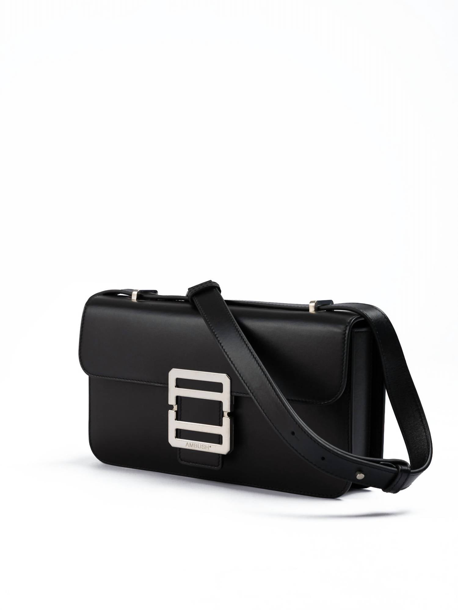 The crossbody bag is a trend that is here to stay and we especially love this style. Introducing the Women's Crossbody Bag by Ambush, a refined accessory crafted for sophistication and style. Made in Italy, this black leather bag features silver logoed hardware for a touch of elegance. Its compact size of H 15 cm x L 27 cm x D 7.5 cm is perfect for those on-the-go moments, combining exclusive design with high craftsmanship. Elevate your ensemble with this timeless piece, designed without dustbags or tags, and shipped with a neutral dustbag.