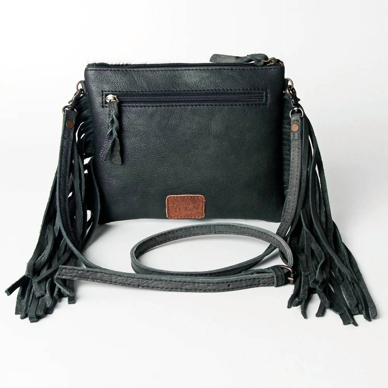 A casual and cute take on everyone's favorite crossbody bag. Discover the Women's Hide With Acid Wash And Fringe Purse Crossbody Bag by American Darling, a delightful fusion of beauty and practicality. This unique black and white bag is expertly handcrafted in small batches, ensuring a distinctive style for each owner. The eye-catching acid wash and fringe details make it a standout accessory for any outfit. Enjoy the craftsmanship and individuality of American Darling bags, proudly made to offer an unparalleled experience.