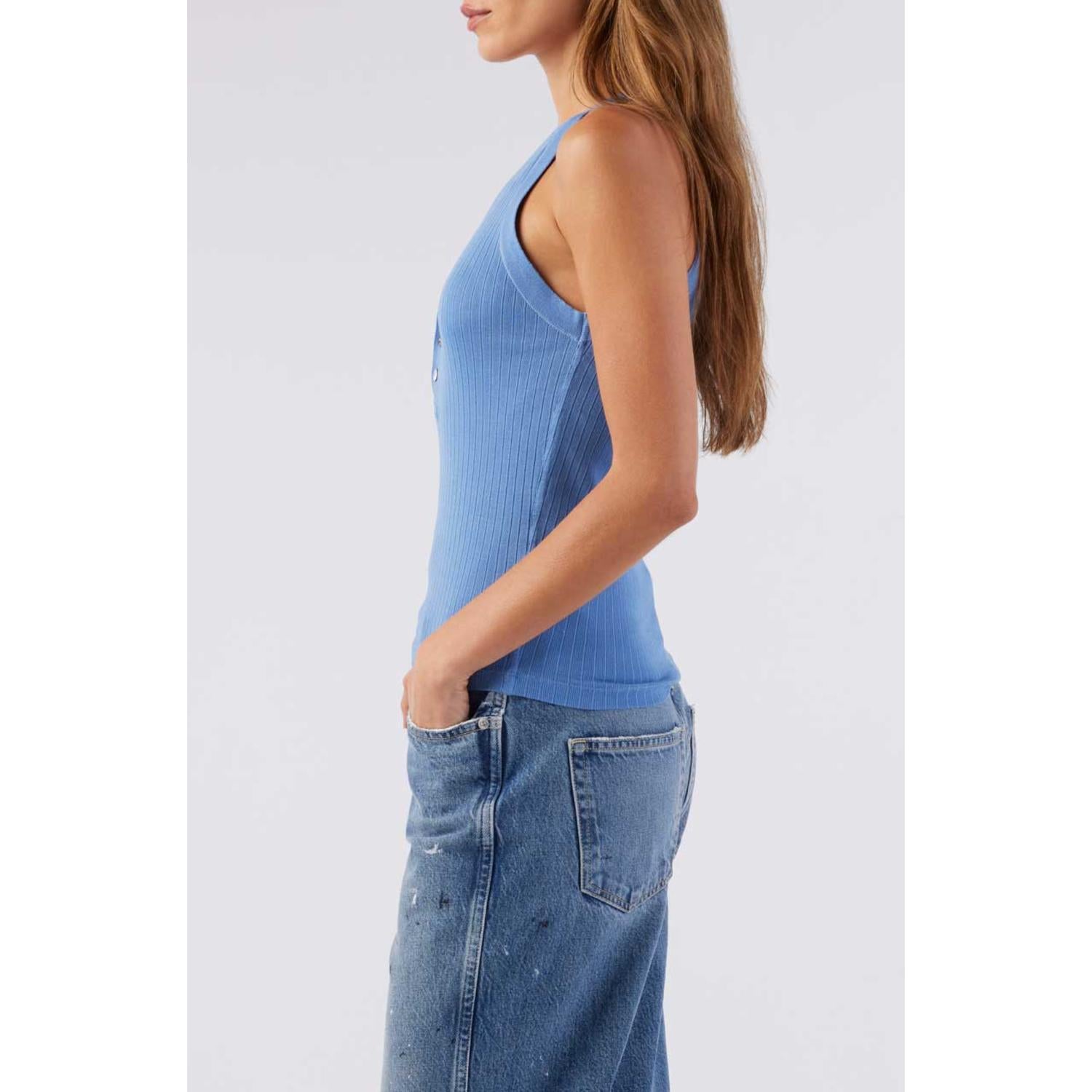 Fit, fabric and functionality. This tank top checks all the boxes. Discover the Fantasy Tank by AMO, a stylish twist on the classic henley designed for a flattering fit. This sleeveless tank in a stunning Marine hue is crafted from 100% cotton that embraces your silhouette seamlessly. With a V-neck and functional button closure, it offers both comfort and versatility. Made with care in Portugal, its garment length of 22 inches makes it an ideal addition to any wardrobe. Care: Machine wash cold. Chest: 25 inches.