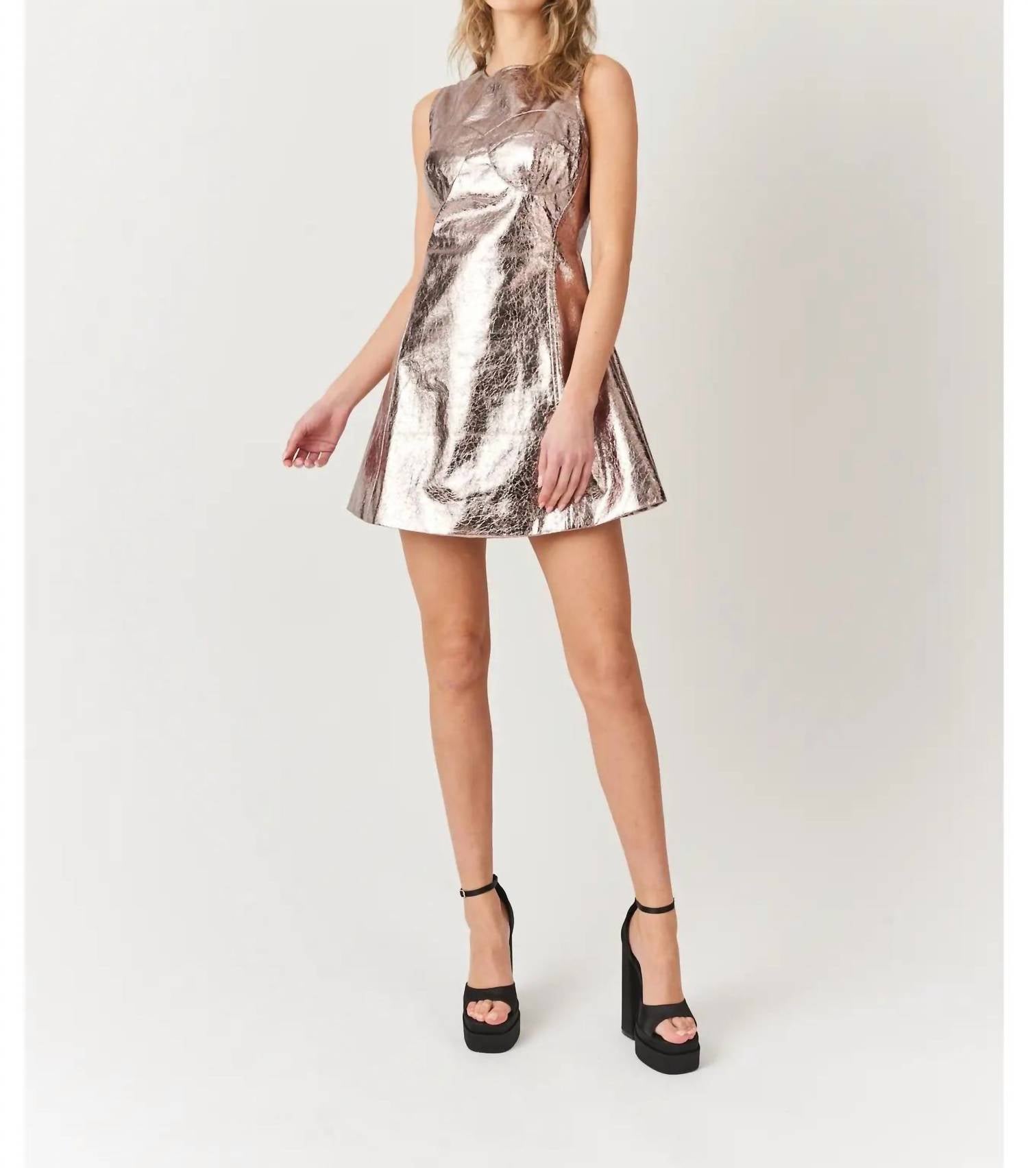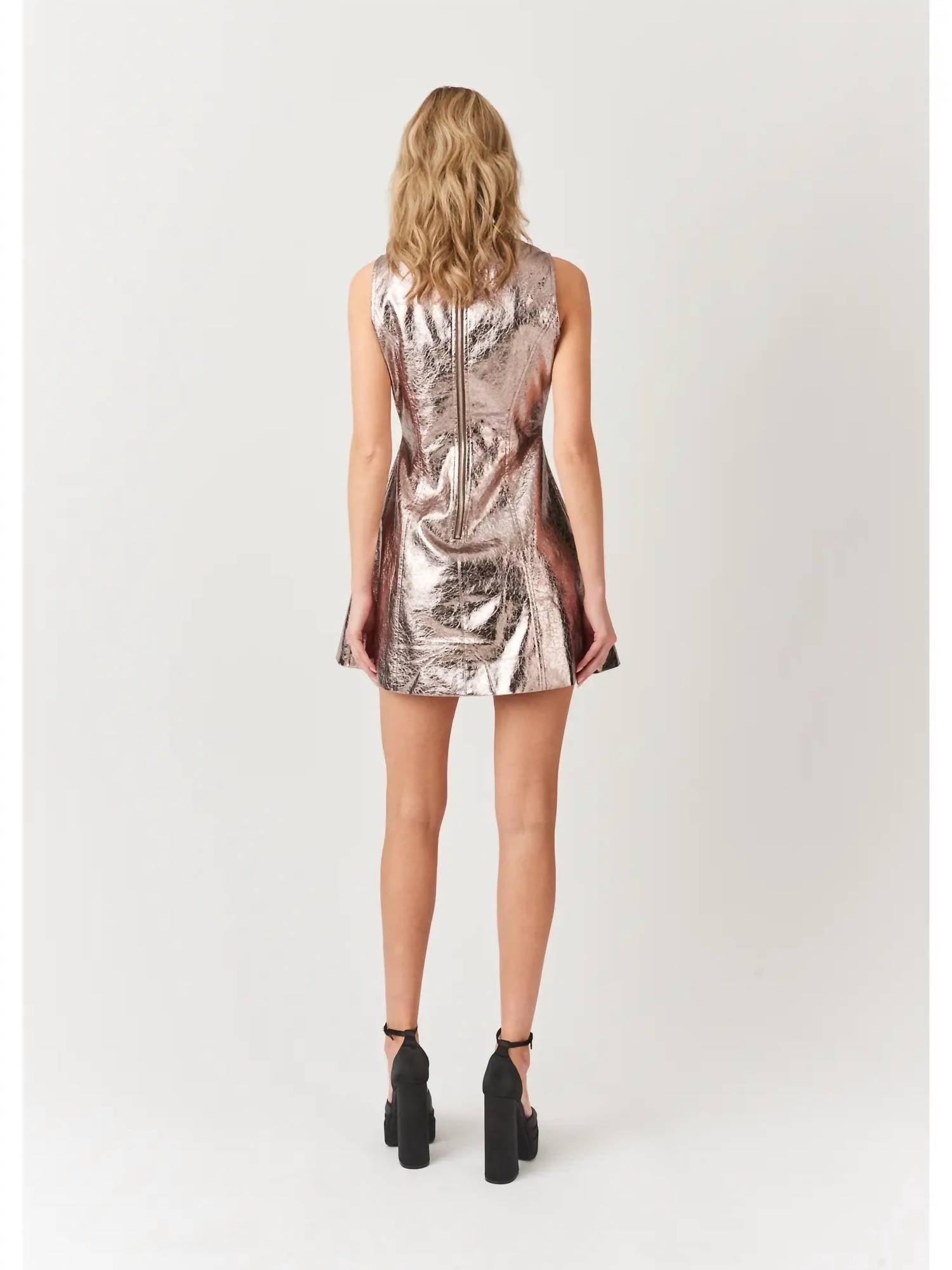 The kind of easy and flattering dress you'll be reaching for all season long. Unveil a bold statement with the AMYLYNN Portia A-Line Sleeveless Faux Leather Mini Dress in eye-catching gunmetal. This striking dress showcases a structured bodice and a flattering A-line skirt, complete with a rear statement zip closure. Crafted from 100% polyester, it embodies the minimalist trend perfect for a spring dinner party. Rendered in a solid pattern, this mini dress is an effortless style choice for any occasion.