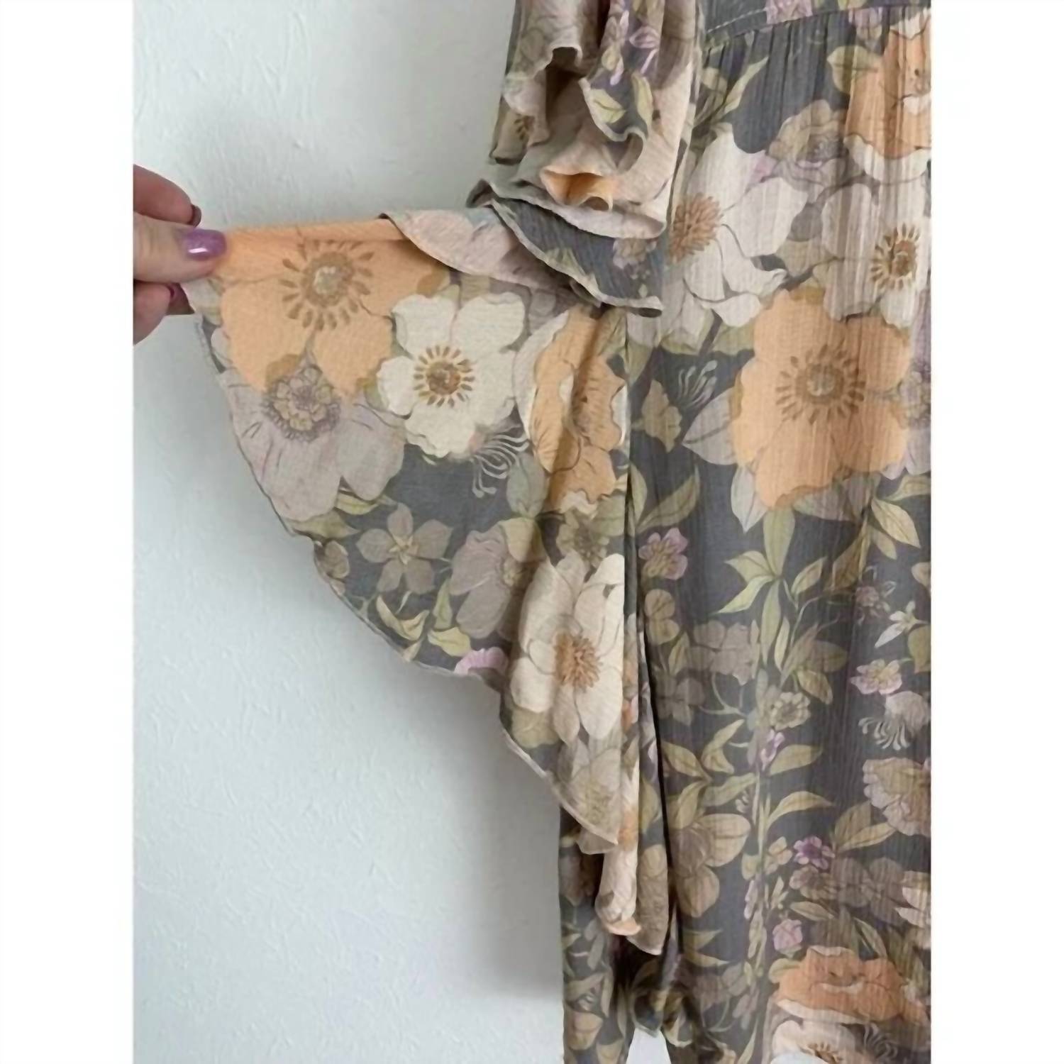 Show a little skin in this cute and casual crop top. Textured Flowers Floral Peach Cream Gray Ruffle Shirt Top.