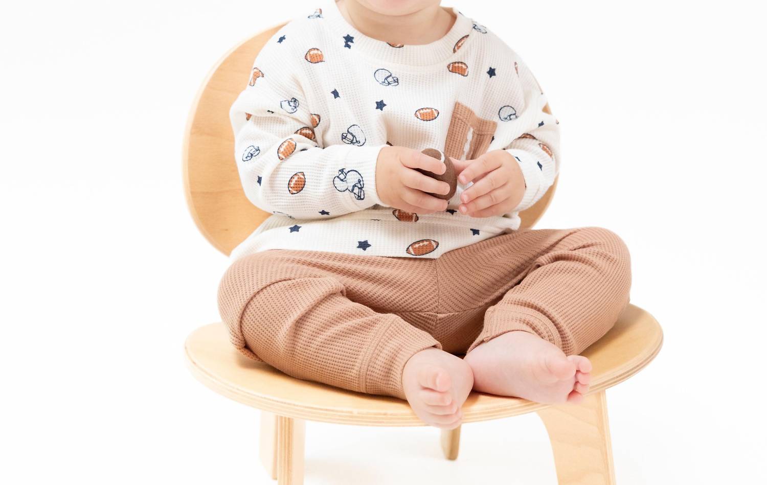 The Boy's Footballs And Stars Waffle Knit Drop Sleeve Shirt With Pocket And Jogger by ANGEL DEAR is a perfect fall ensemble for little fans. Crafted from a cozy cotton blend, this matching set in brown features a soft, textured waffle knit providing both warmth and breathability. The shirt boasts drop sleeves and a fun football-shaped pocket, while the joggers offer a comfy waistband and snug cuffs. Designed for ease, it comes with a pull-on closure and can be machine washed for easy care. Ideal for holiday parties or casual game day events.