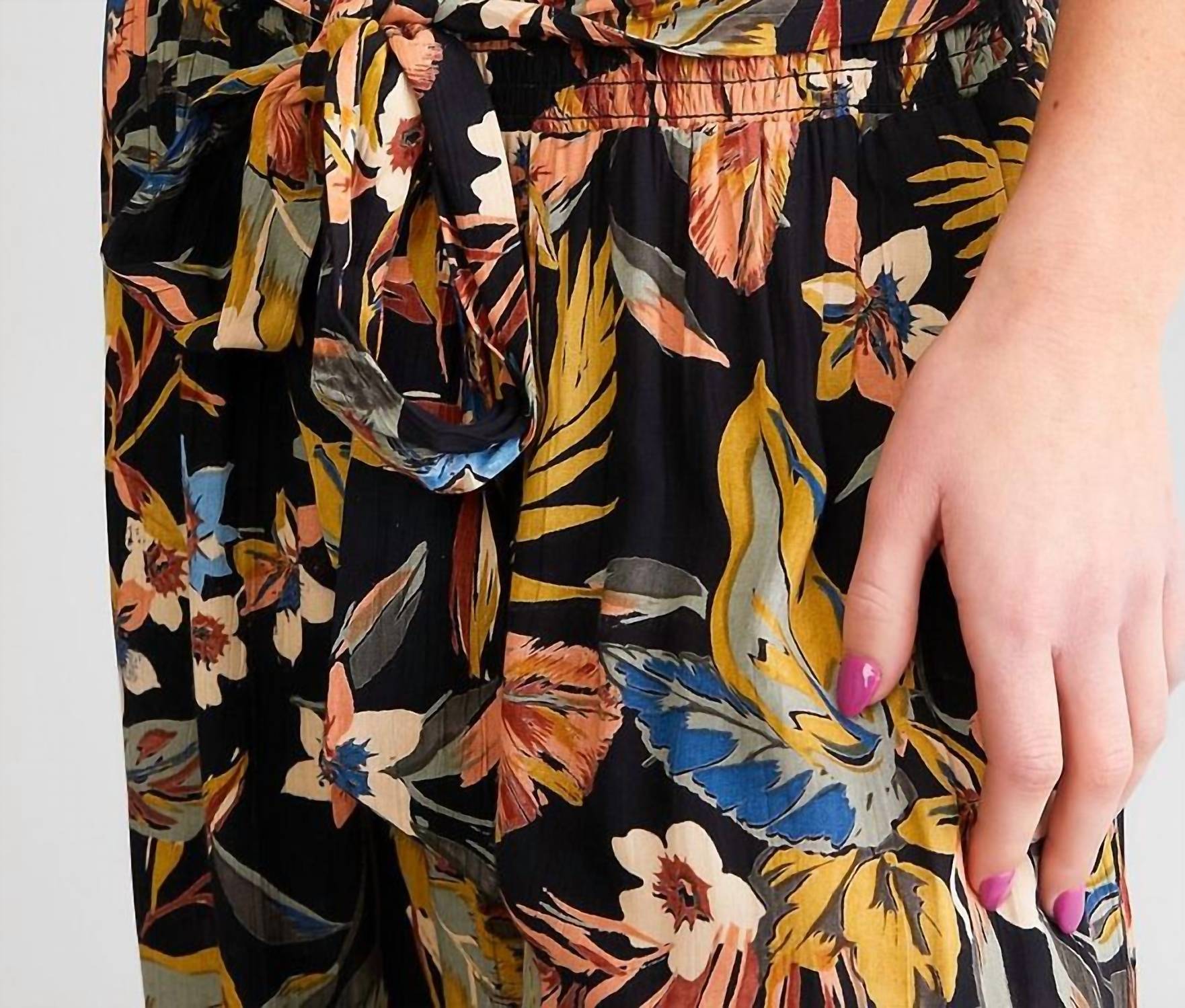 Step into the sunshine with ANGIE's Tropical Garden Pants, featuring a vibrant all-over tropical print in Black Multi. These women's wide-leg pants provide a relaxed fit with a high rise, crinkle-woven fabric, and a smocked tie waistband for comfort and adjustability. Made of 100% Rayon, these pants have an inseam of 29" (Small) and a rise of 13" for ultimate comfort, while offering a pull-on closure for easy wear. Perfect for summer vacations, care instructions recommend machine washing and laying flat to dry.