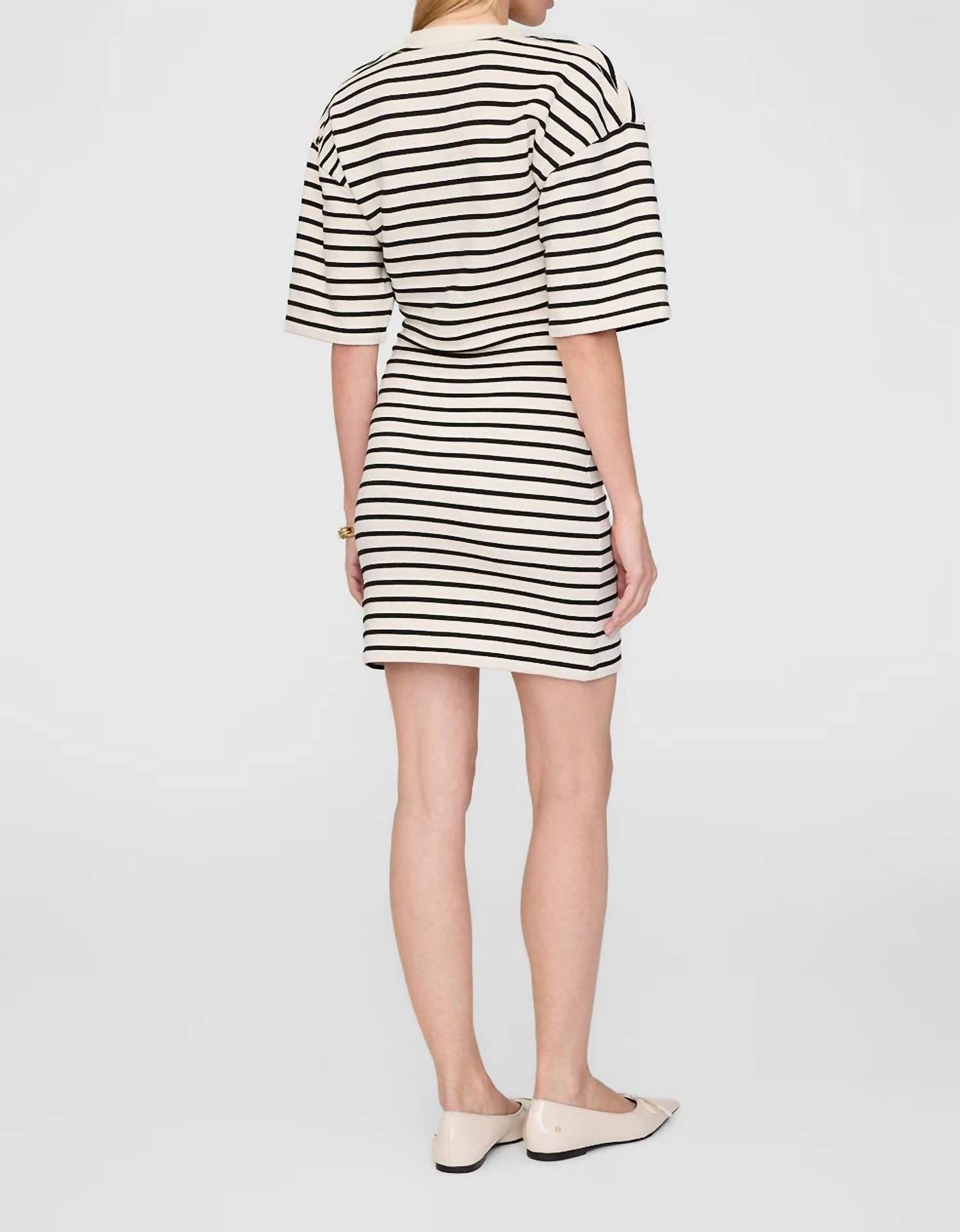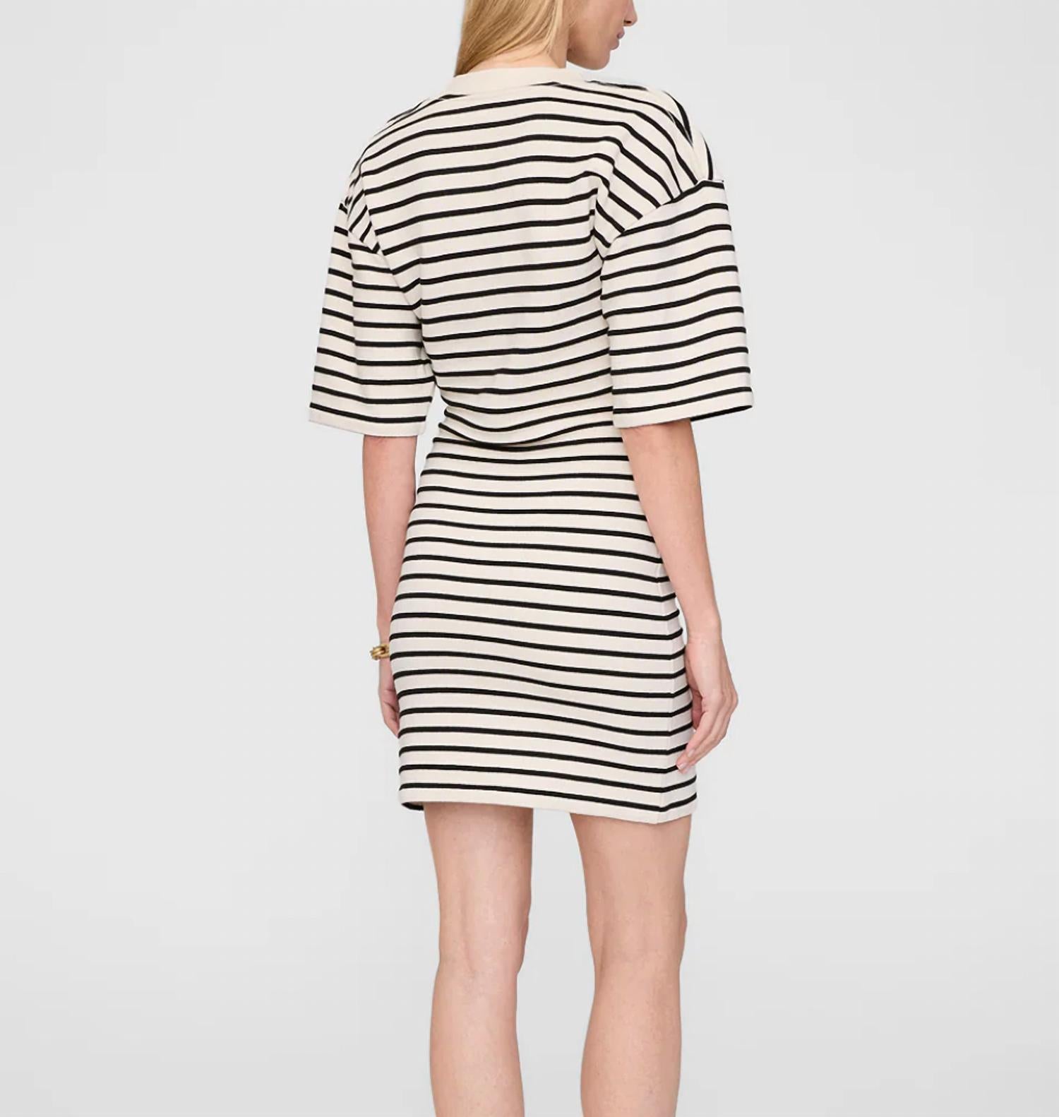 The kind of easy and flattering dress you'll be reaching for all season long. The Mona Dress by ANINE BING is an elegant choice for any holiday party, featuring short sleeves and a striking black/white stripe pattern. Made from a comfortable Cotton French terry blend (83% Cotton, 17% Polyester), this pull-on mini-length dress is designed with a crew neckline and voluminous, boxy sleeves. The addition of removable shoulder pads and an ivory-framed monogram embroidered at the chest adds a touch of sophistication. Perfect for spring occasions, this dress exemplifies a close fit shift silhouette ideal for women seeking style and comfort.
