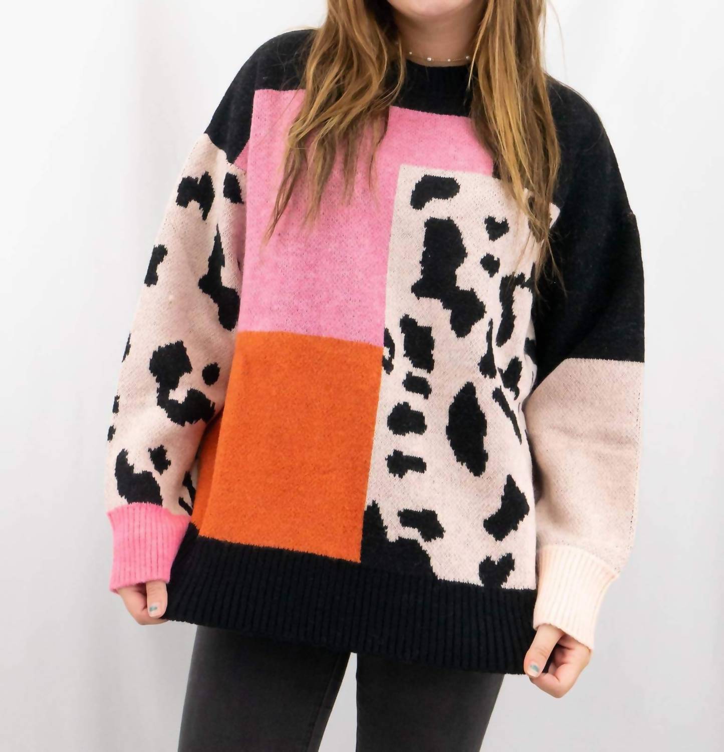 Stay warm and stylish in this versatile and effortlessly cool knitwear staple. Wear it alone or layered, it's the perfect sweater for the season and you'll wish you had it in every color. Embrace bold style with the Leopard Color Block Sweater by AnnieWear, a striking choice in a Pink Multi palette. This long-sleeve sweater combines contemporary flair and trendy patterns, perfect for making a statement. Crafted with 40% Acrylic and 25% Nylon, it features a crewneck and is designed for a comfortable true-to-size fit. Easily pull on this patterned piece to effortlessly elevate your holiday party wardrobe. Model shown is 5'6" wearing a size small.
