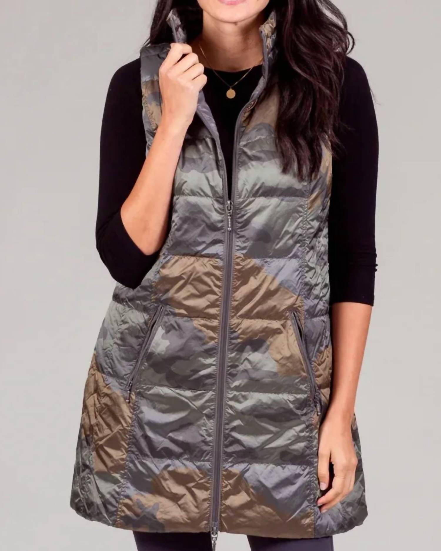 That extra layering piece you didn't know you needed! Stay warm and stylish with the ANORAK Long Nylon Down Vest in Silver Camouflage, a standout piece in our winter collection. This sleeveless vest is expertly crafted from 100% water-resistant nylon for durability, with a fill of 80% white duck down and 20% feather for added warmth. It features a zip closure and zip-close pockets, making it both functional and fashionable for any streetwear ensemble. Care for this versatile garment is easy with machine wash cold and low tumble dry instructions. Plus sizing makes it perfect for vacation-ready looks.