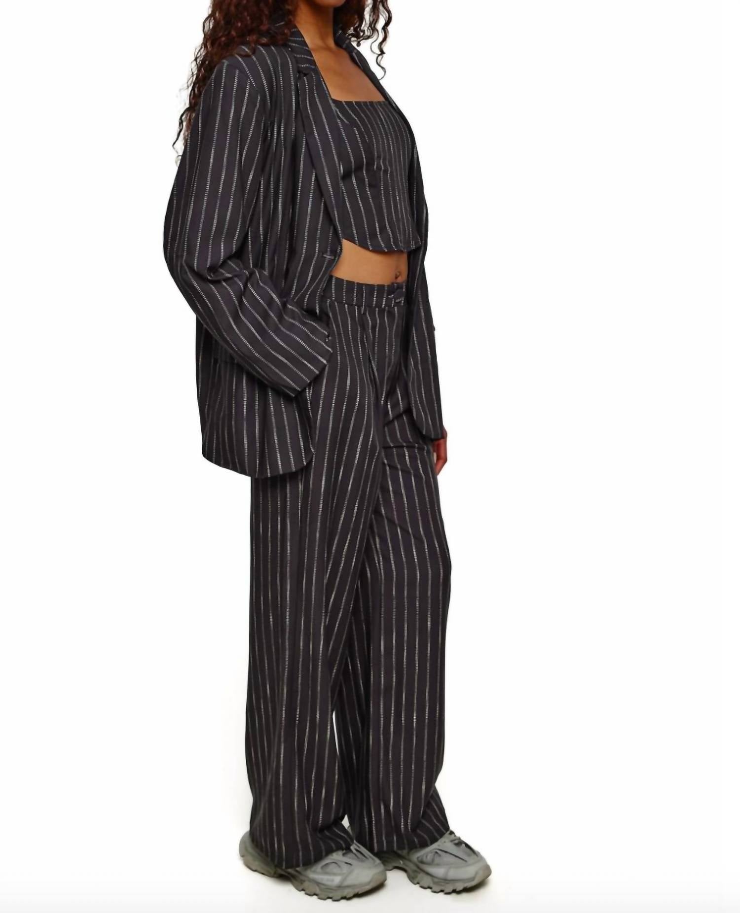 Introducing the Pinstripe Oversized Blazer by ANOTHER GIRL, a chic addition to your wardrobe in a navy pinstripe pattern. Designed with long sleeves, this blazer is crafted from a suiting blend, perfect for a modern, structured look. Originating from a thoughtful design process, it features notched lapels, shoulder pads, front flap pockets, and a relaxed double-breasted silhouette with button closure. For optimal care, please dry clean only.