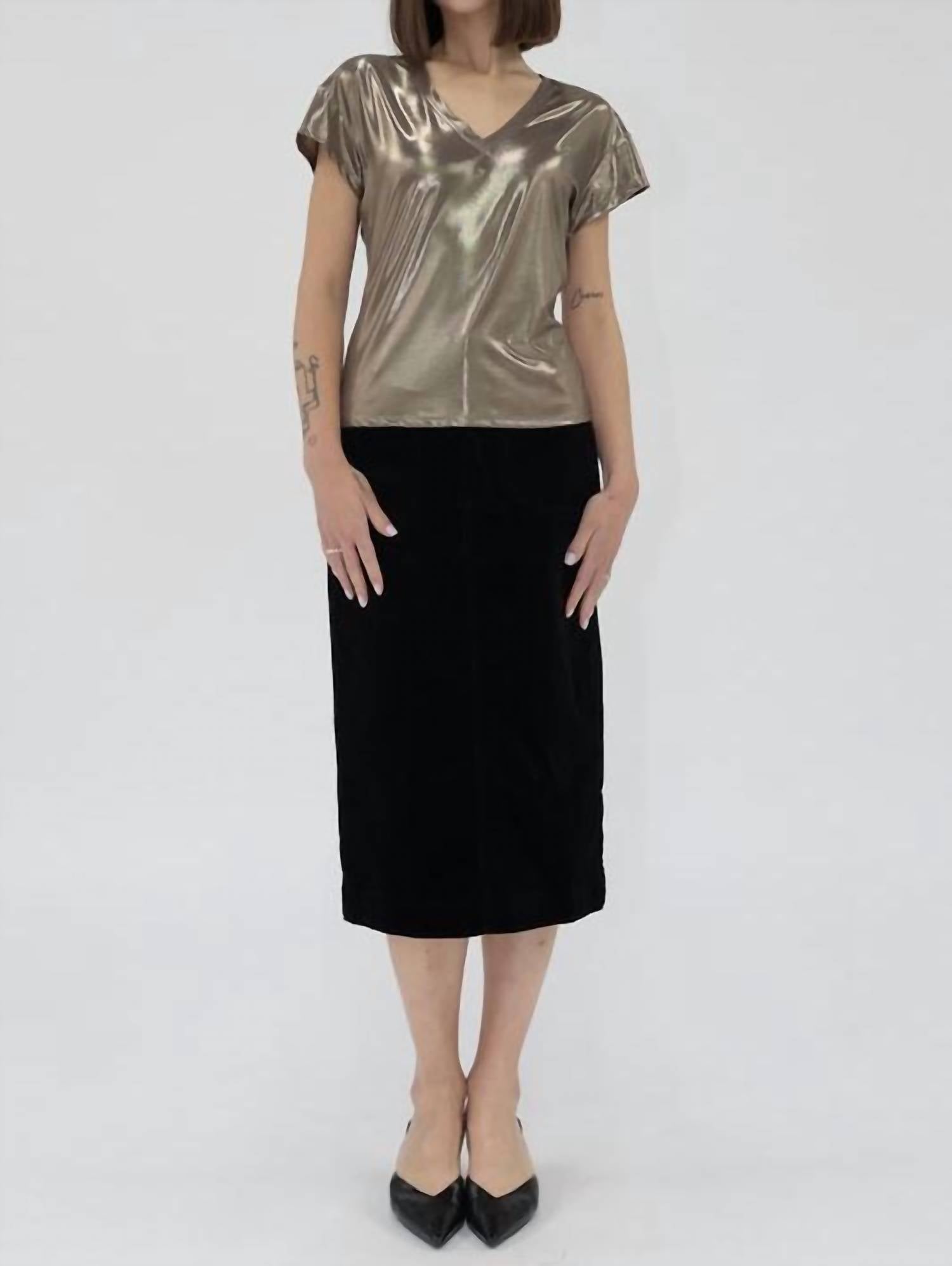 The short sleeve tee you'll want in every color. Introducing the Lumi Metallic Top by Another Love, a show-stopping piece in glimmering gold perfect for a holiday party. This short sleeve tee features a chic V-neckline and a relaxed fit for comfortable elegance. Crafted from 100% polyester, this top offers a glamorous touch to your wardrobe essentials. Care instructions include hand wash and lay flat to dry. Closure: Pull on.