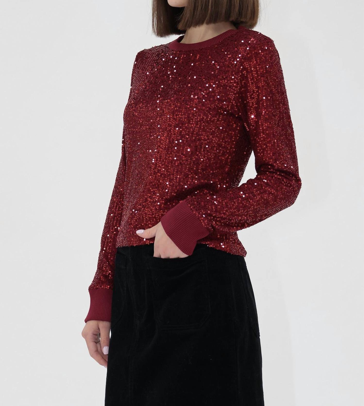 A timeless blouse that will never go out of style. Elevate your style with the Nessa Long Sleeve Sequin Top by Another Love, a perfect choice for making a statement. This stunning red top features long sleeves and a crewneck, crafted entirely from shimmering 100% Polyester sequins. Designed with a relaxed classic fit, it offers a garment length of 22 inches, ideal for effortless pairing with any bottoms. Enjoy the easy pull-on closure, and revel in the eye-catching style suitable for any holiday party or festive occasion. Bust: 36" and Sleeve length: 24" (Size Small).