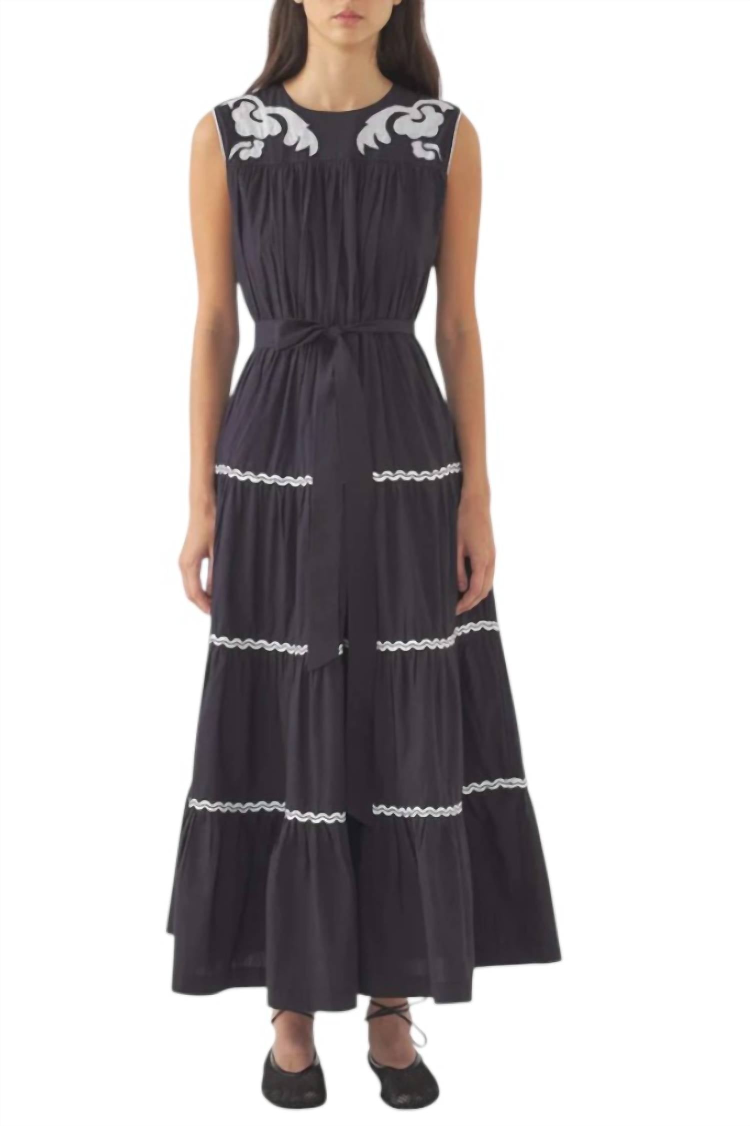 A midi dress so versatile, your options for wearing it are endless. Experience bohemian-chic elegance with the Dali Sun Dress by Antik Batik, crafted in dark navy cotton for a summer-ready vibe. This sleeveless masterpiece is maxi-length and skillfully embroidered with tonal navy beading, boasting a round crewneck and contrasting white piping at the sleeves. Featuring a self-tie belt and tiered skirt, it offers a flattering fit-and-flare silhouette, making it ideal for vacations. Made from 100% cotton and closed with a hidden back zip, this dress promises effortless style with a boho chic trend.