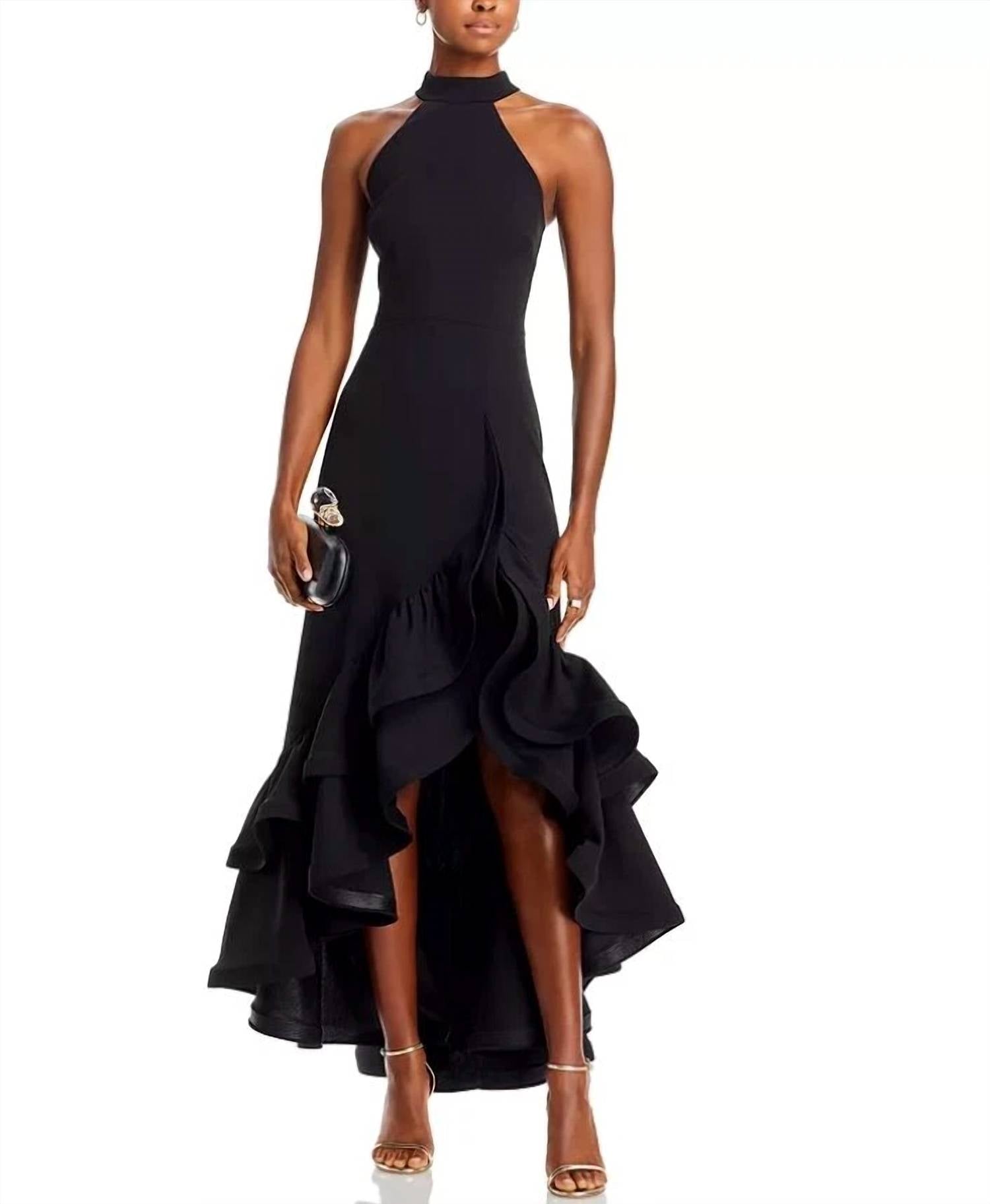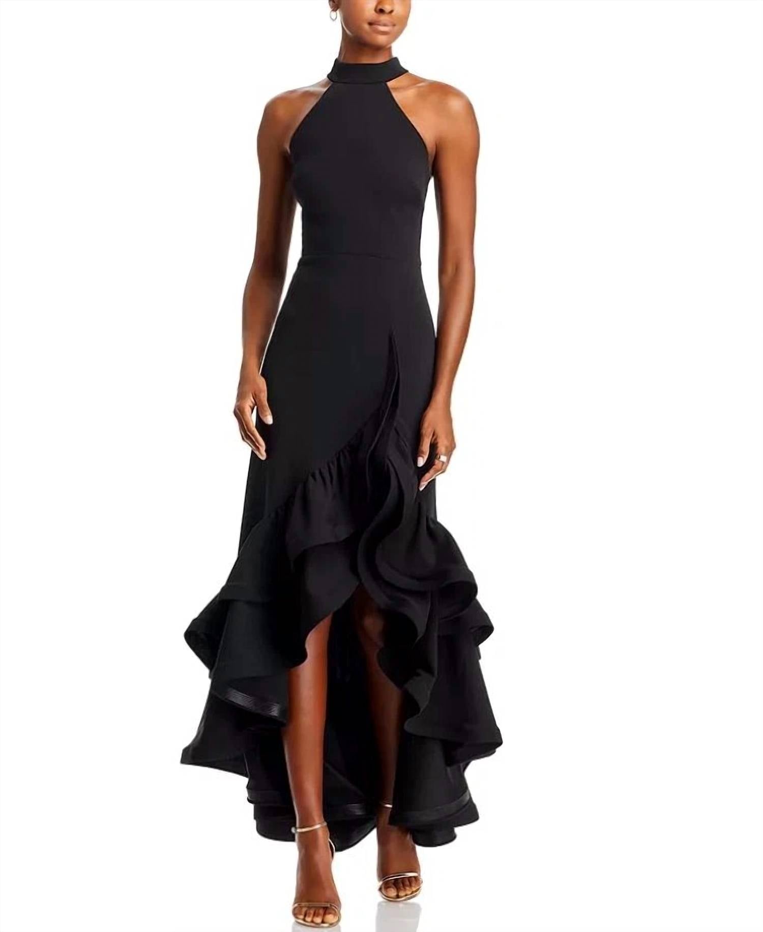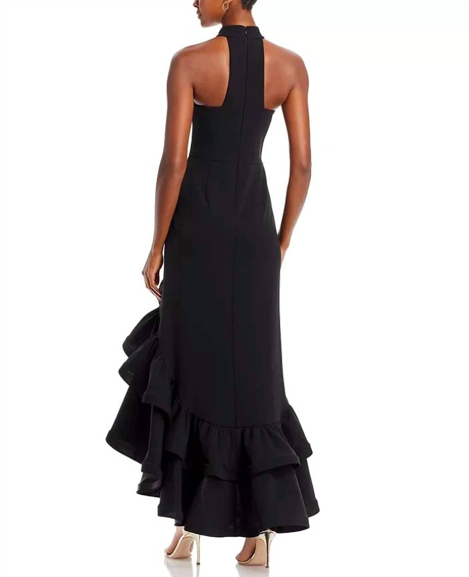 The pefect high-low dress for those transitional seasons. Elevate your evening attire with AQUA's Racerback Sleeveless Ruffle Hem Gown in elegant black, a Bloomingdale's exclusive. Featuring a sleeveless design and chic mermaid silhouette, this gown is crafted from high-stretch fabric comprising 94% polyester and 6% spandex, with a 100% polyester lining for a comfortable fit. The gown measures approximately 61.75 inches from shoulder to hem, designed for a floor-length look. Made in the USA, it boasts a back zipper closure and requires dry cleaning.