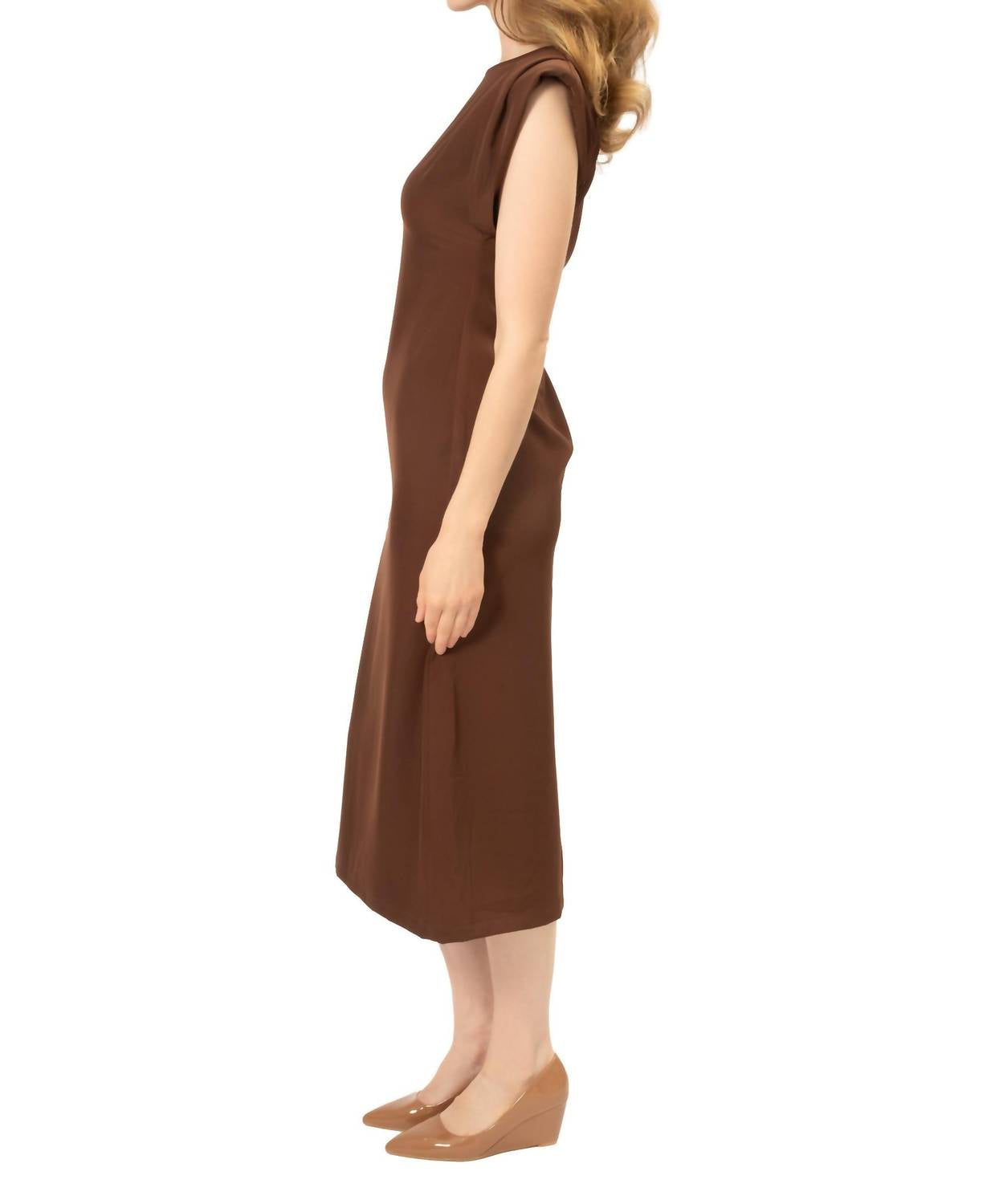 Just add slides or mules and you are good to go. Introducing the Jera Dress by Area Stars, perfect for your next holiday party with its sophisticated solid brown hue. This women's midi shift dress features cap sleeves and a classic crewneck for an elegant look. Designed with a convenient zip closure for easy wear. This dress, ideal for the spring season, is crafted for those who appreciate timeless style and comfort.
