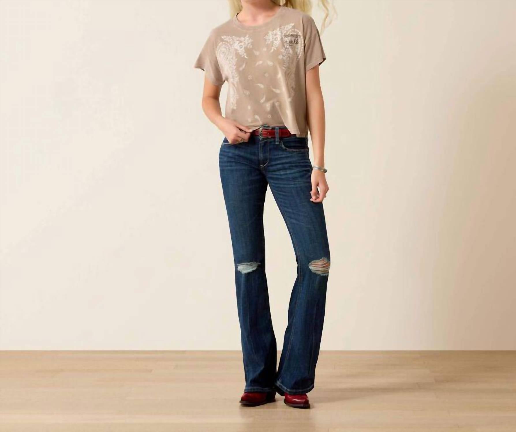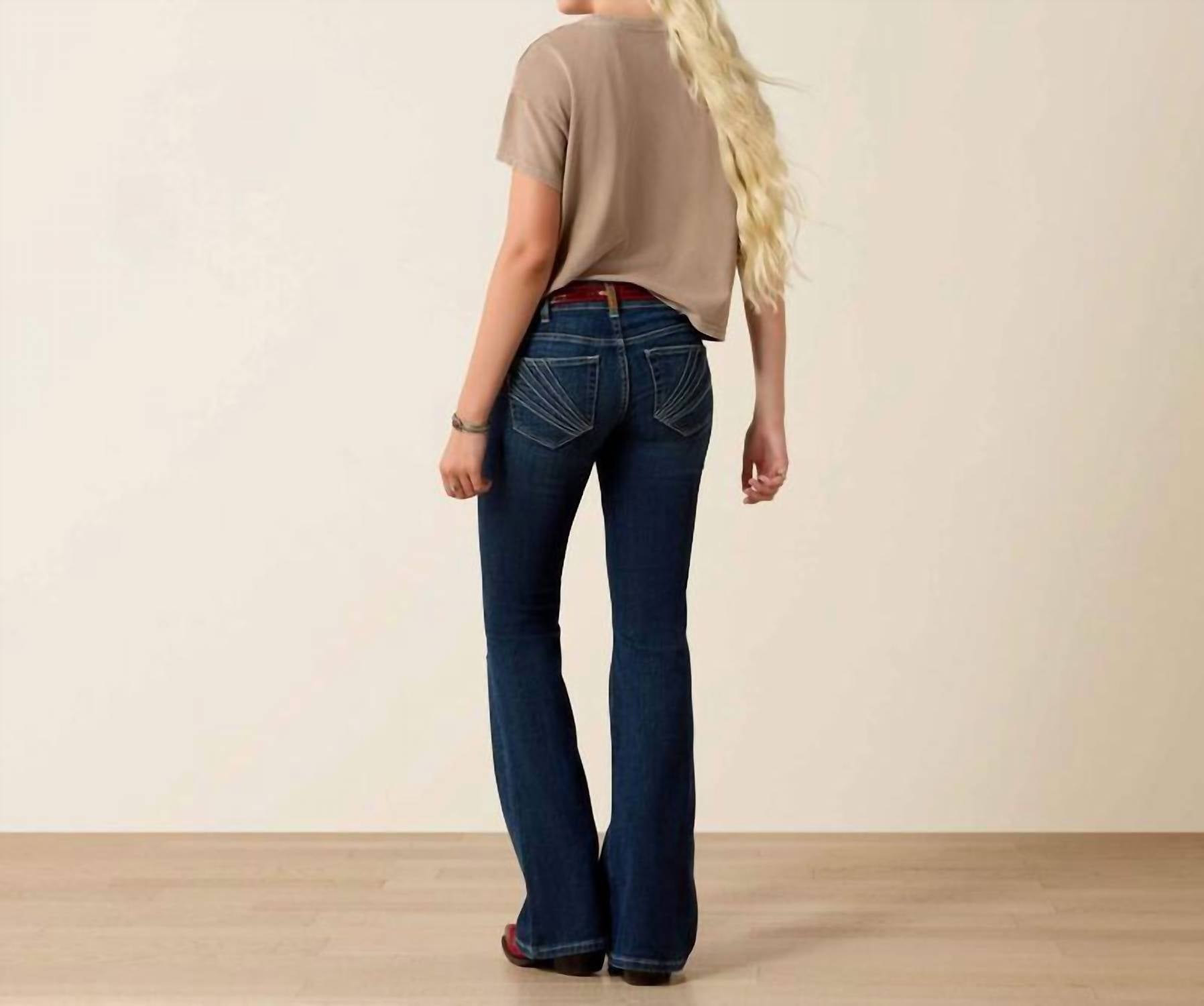 Pair these wide leg jeans with mules, slides or your favorite strappy sandals. Introducing the Perfect Rise Christine Flare Jeans by ARIAT in a striking Siren shade, designed for a flattering look. These women's flare and wide-leg jeans feature a mid-rise 9" perfect rise, sitting comfortably just below the waist. The slim fit through the hip and thigh transitions to a flared leg with a 21 ¾" leg opening, while a contoured waistband ensures a fit that moves with you. Crafted from a cotton blend of 95% cotton, 4% elasterell, and 1% elastane, these jeans offer both comfort and stretch. Closure: Button closure. Care: Machine wash. Ideal for embracing 90s fashion this spring during travel.