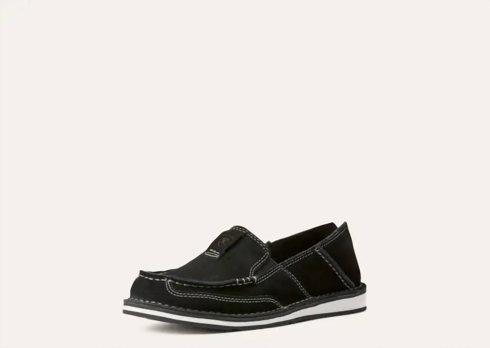 A classic loafer that is both comfortable and polished. Step into effortless comfort with the Women's Suede Cruiser Flat by ARIAT, crafted in chic black suede for a minimalist look. Designed with a flat heel and round moc toe, these flats feature side stretch elastic panels for easy wear and a lightweight EVA midsole to absorb shock. The Duratreadâ„¢ sole ensures maximum wear resistance, complemented by stitch-out construction for lasting durability. Ideal for spring errands or casual strolls, these flats have a 2" shaft height and are available in a medium shoe width.