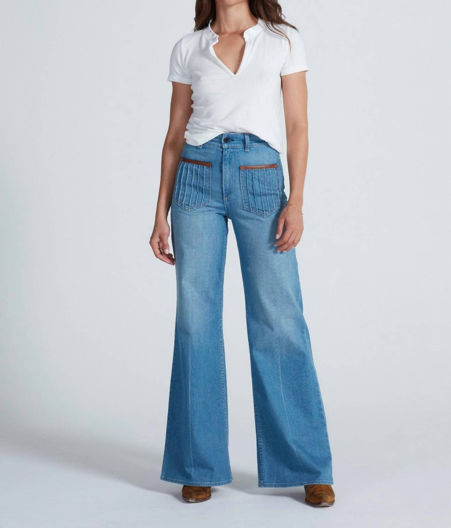 Pair these wide leg jeans with mules, slides or your favorite strappy sandals. Embrace style with the ASKK NY London Wide Leg Flare Jeans in a refreshing Hanvana shade, perfect for a casual yet chic look. These women's jeans are made from 100% Cotton and showcase a relaxed fit with a high-rise design and wide leg flair. With accents on the front top pockets and a solid pattern, they feature a functional button closure. Care for these light wash jeans is simple — just machine wash them to keep their streetwear vibe fresh.