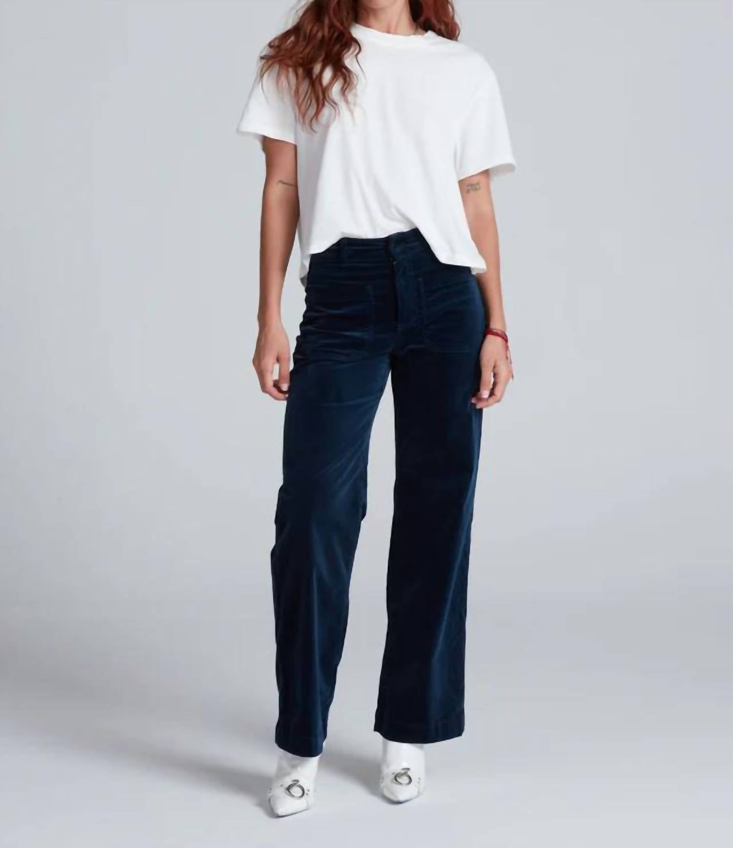 Introducing the Sailor Velvet High Rise Wide Leg Pants by ASKK NY, a luxurious take on a classic silhouette crafted in a rich navy shade. These pants boast a high rise with a relaxed wide leg and feature iconic sailor pocket details for added flair. Made from an 8 oz stretch velvet comprising 98% cotton and 2% polyurethane, they offer both comfort and style, perfect for both day and evening events. Closure: Button closure. Inseam: 30 inches, Rise: 12 inches, Leg Opening: 20 inches. Care: Machine wash cold, do not tumble dry. Model is 5'9" and wears a size 25.