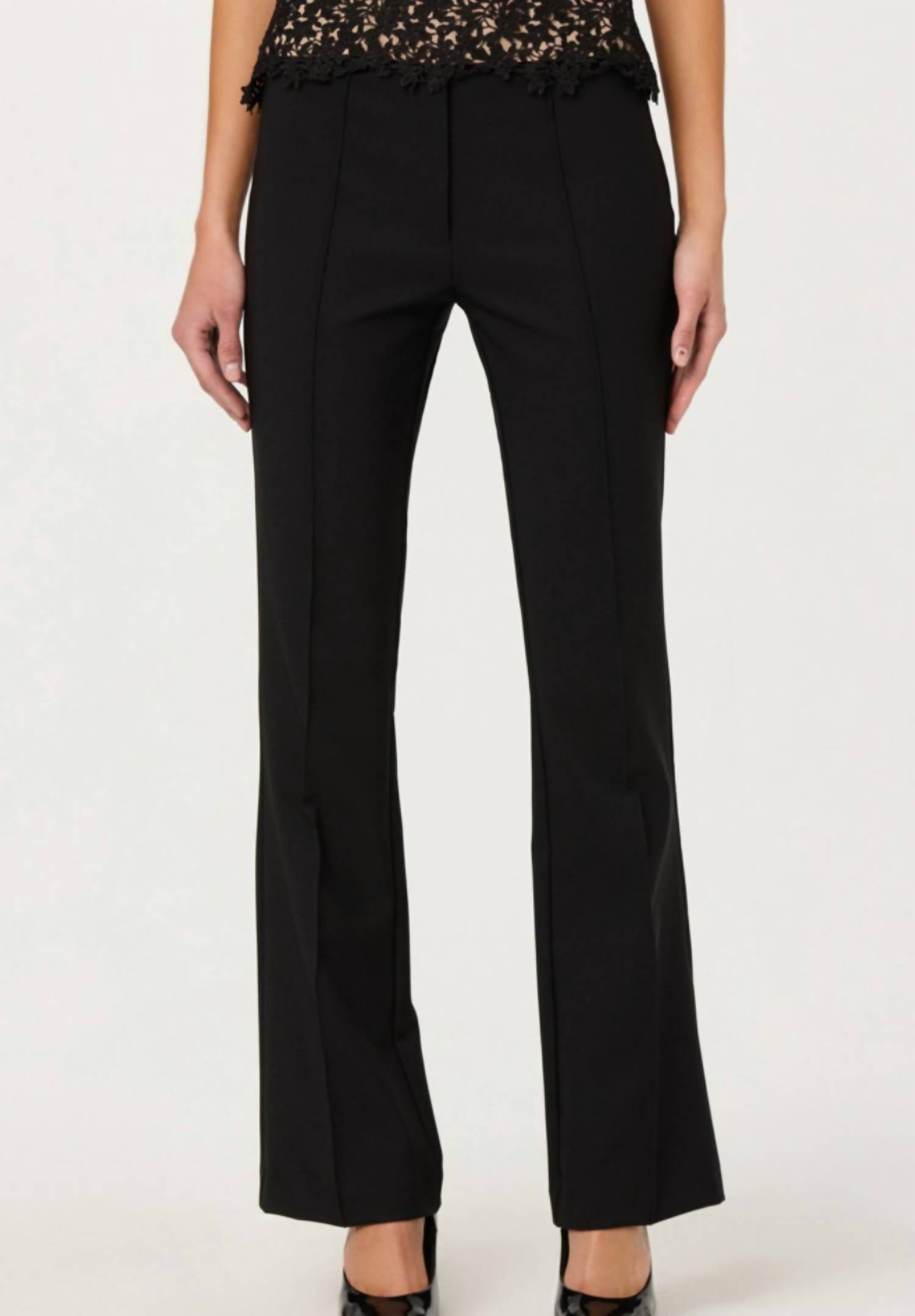 The trend report says boot-cut is in and that's exactly why we love this style. They are fit to perfection, flattering on any body type, and comfortable. They will be your go-to all season long. Step out in style with the Andie Pants by ASTR, designed for a sophisticated business casual look. These black pants, made from a nylon blend, feature a mid-rise and regular fit, with a tailored flared leg accentuating your silhouette. They come equipped with functional belt loops and decorative faux back pockets, offering both practicality and elegance. The pull-on closure ensures ease of wear, while the minimalist design pairs beautifully with lightweight sweaters and delicate tops. Care: Dry clean only.