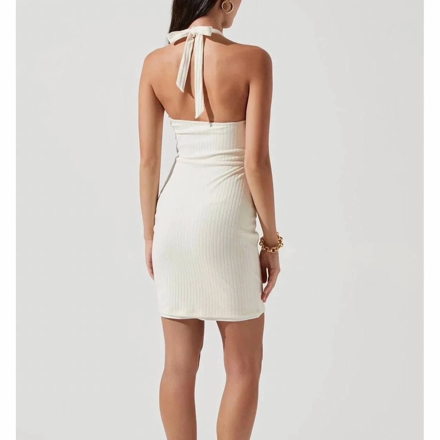 The perfect mini dress for those warmer months. Introducing the ASTR Del Mar Mini Dress, an elegant vacation essential in Off White cream with a textured, ribbed knit construction. This sleeveless, bodycon silhouette features a halter neckline with tie straps and a low cut back, offering a chic, minimalist look. Crafted from 100% polyester for the self and 95% polyester with 5% elastane for the lining, this dress offers a stretch fit and is fully lined. The dress is designed with a convenient pull-on style; care instructions include hand washing cold and laying flat to dry.
