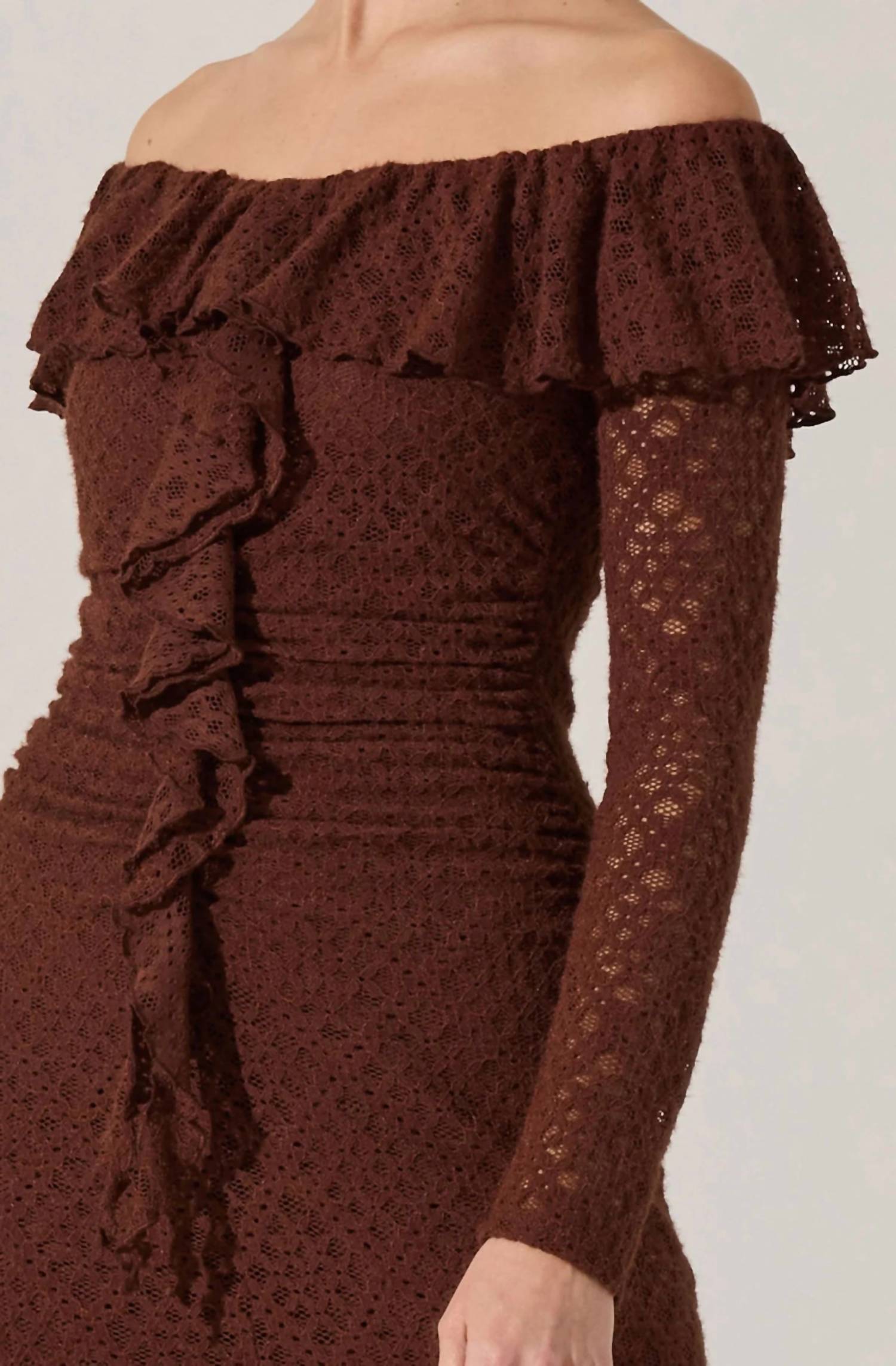 Cute and comfortable, this long sleeve dress has it all. Introducing the Dorian Long Sleeve Dress by ASTR, a sophisticated choice for your next evening event or Thanksgiving celebration. This elegant design features long sleeves and an off-the-shoulder neckline, accentuated by a ruffled top overlay and allover lace for a touch of romance. Crafted from a blend of 95% nylon and 5% elastane with a 100% polyester lining, this imported dress offers a minimalist sheath silhouette in a rich brown hue. Closure: Pull-on style. Care: Dry clean only.