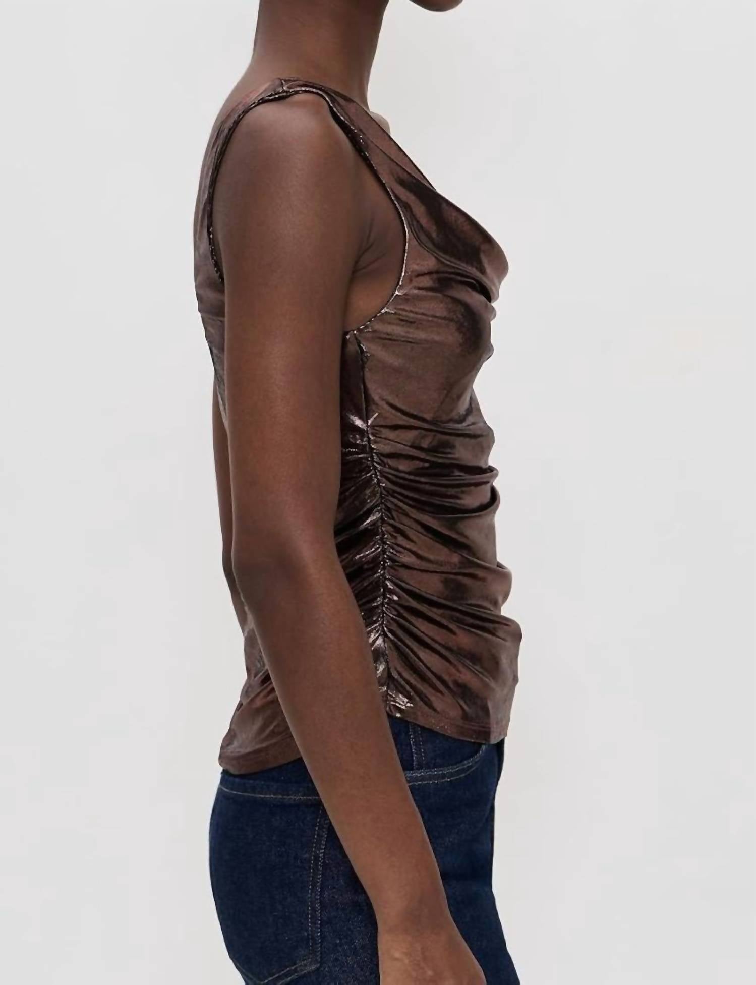 Pair this with your favorite jeans and slides for your next girls night out. Introducing the Leanne Metallic Top by ASTR, a standout piece in a rich brown hue perfect for cocktail parties. This sleeveless blouse is crafted from polyester and features a chic cowlneck design. Closure: Pull-on style. Care: Dry clean only.