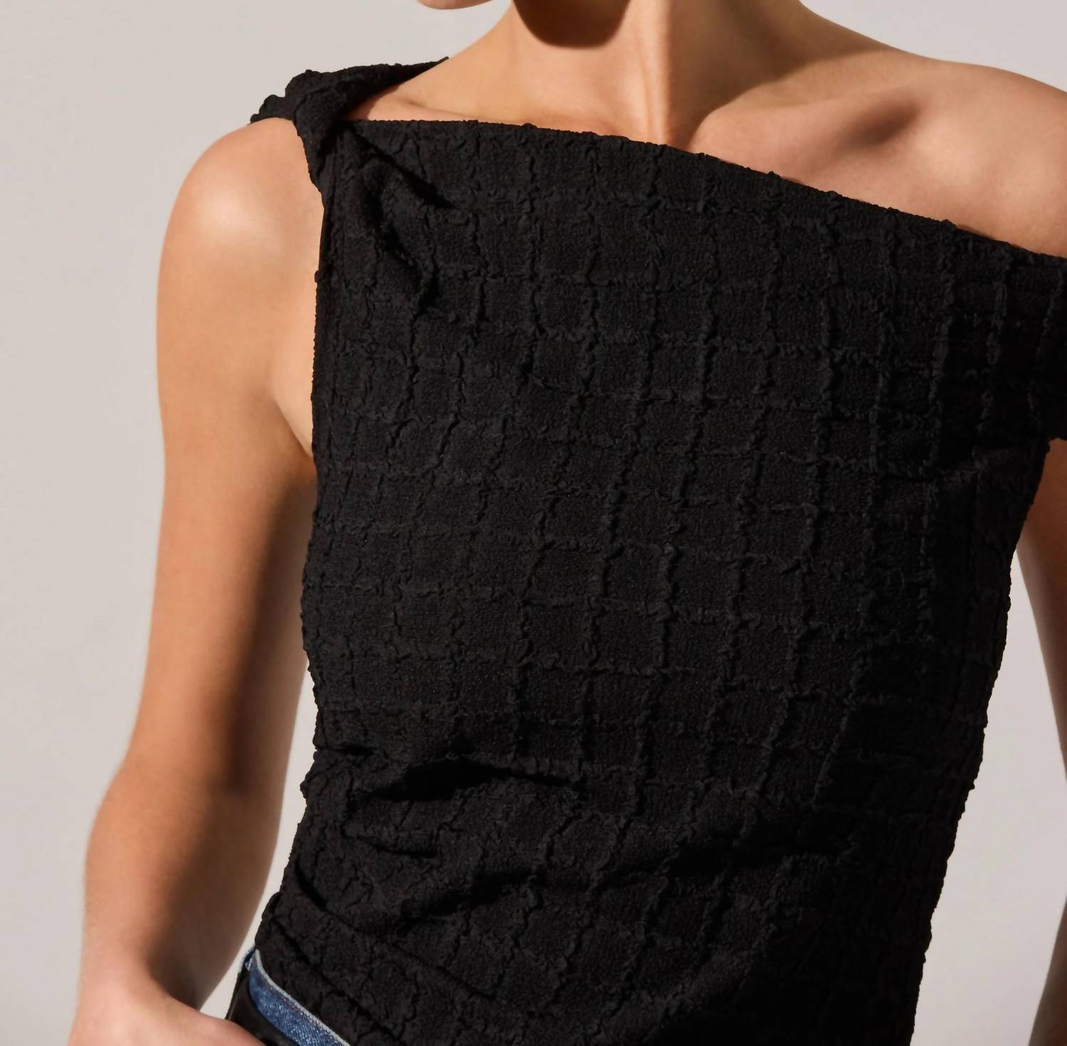 A timeless blouse that will never go out of style. Meet the Lindy Top by ASTR, an exquisite choice for any stylish occasion. This sleeveless black top, crafted from 100% polyester, showcases a chic off-the-shoulder neckline and a soft textured knit. With a convenient pull-on closure and ruched sides to flatter your figure, this 22" length design is your perfect companion for a night out or a getaway. Care: Dry clean only. The model is 5'8" and wears a size small (Bust: 32 ½").
