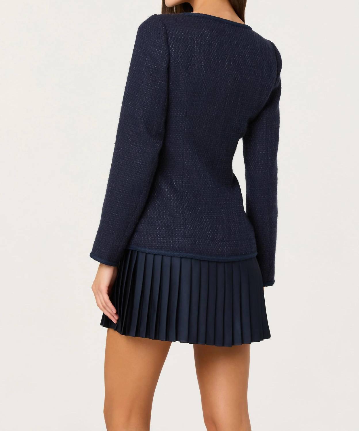 The pefect long sleeve dress for those cooler months. Introducing the Malorie Dress by ASTR The Label, a sophisticated choice for your next cocktail party. This navy blue dress features long sleeves and a chic shift silhouette, accentuated by a scoop neckline. Crafted with a polished look, the tweed top contrasts elegantly with the satin skirt, while gleaming gold button closures add a hint of sparkle. Prioritize care with dry cleaning to maintain its luxurious appeal.