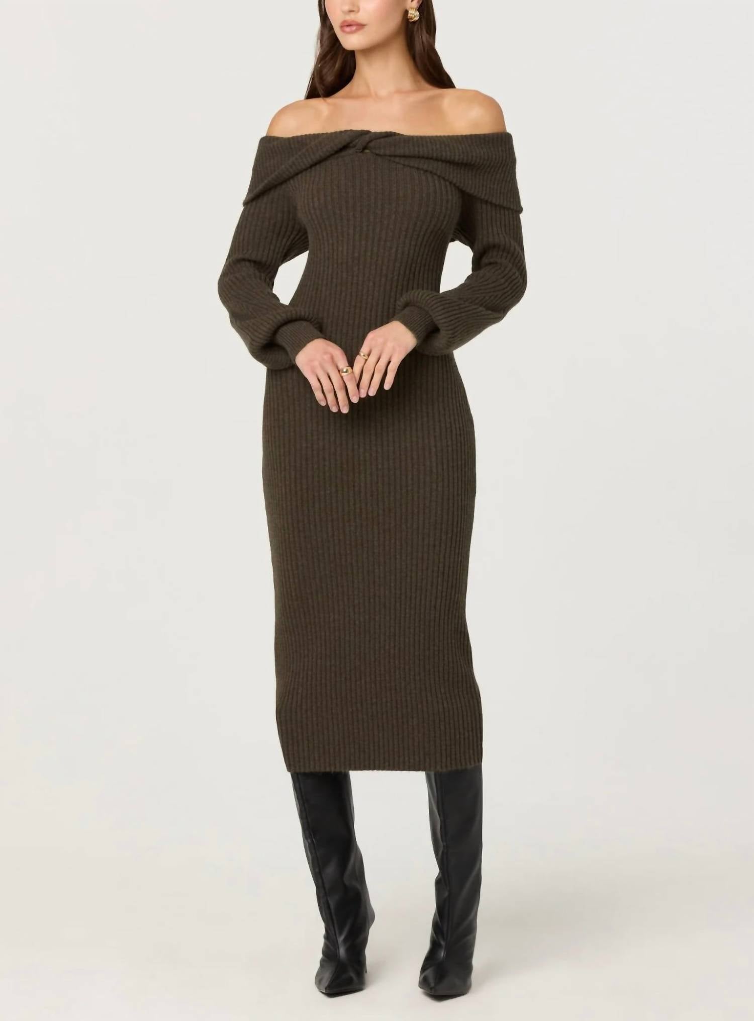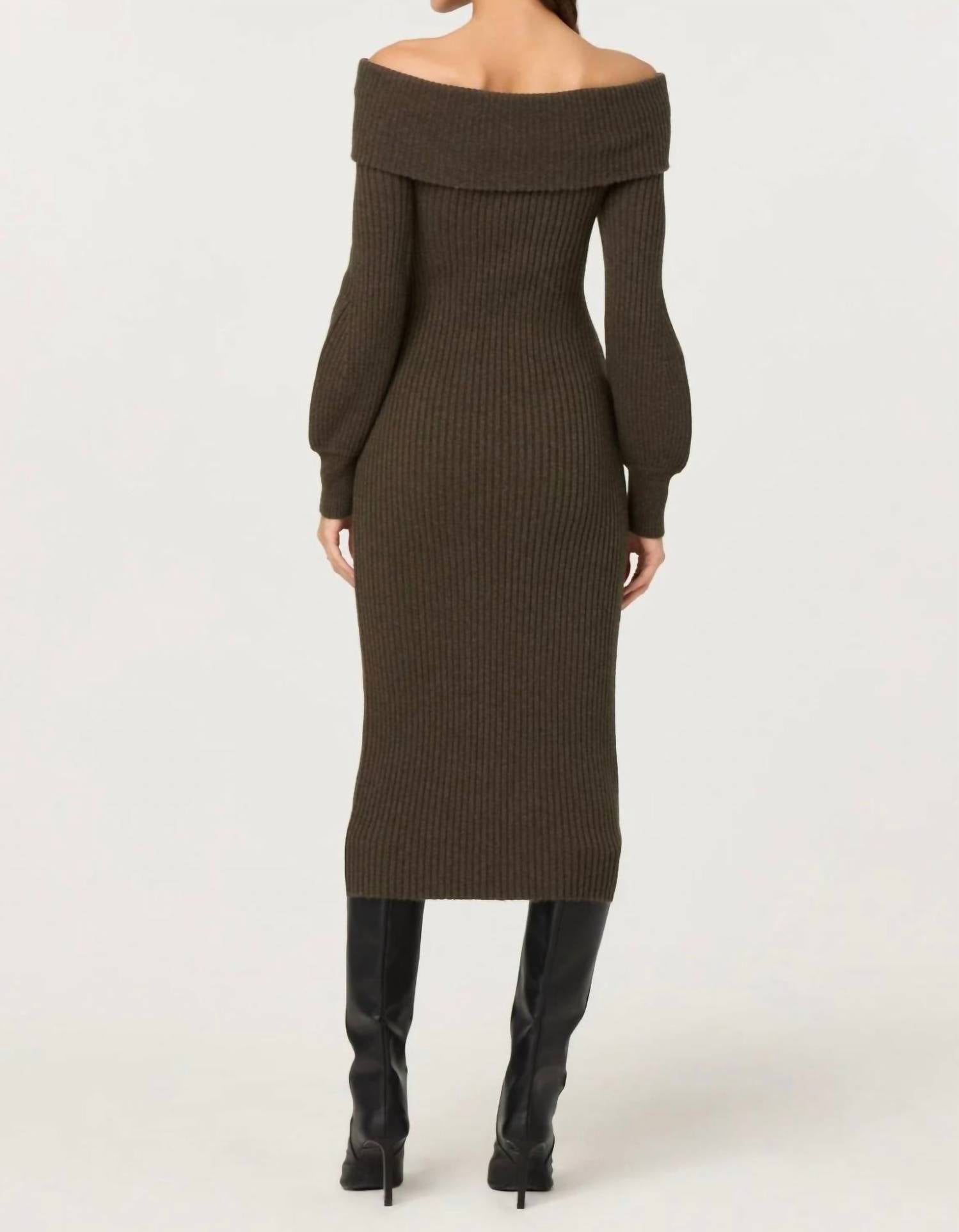 The pefect long sleeve dress for those cooler months. Presenting the Tilde Off Shoulder Midi Sweater Dress by ASTR, a sophisticated choice for your evening events. This walnut-hued dress features elegant long sleeves and a stylish pullover design. Crafted from a blend of 50% nylon, 35% wool, and 15% acrylic, it offers a close, bodycon fit with a minimalist appeal. Designed for a refined fall look, this dress seamlessly combines comfort and style with its off-the-shoulder neckline and versatile midi length.