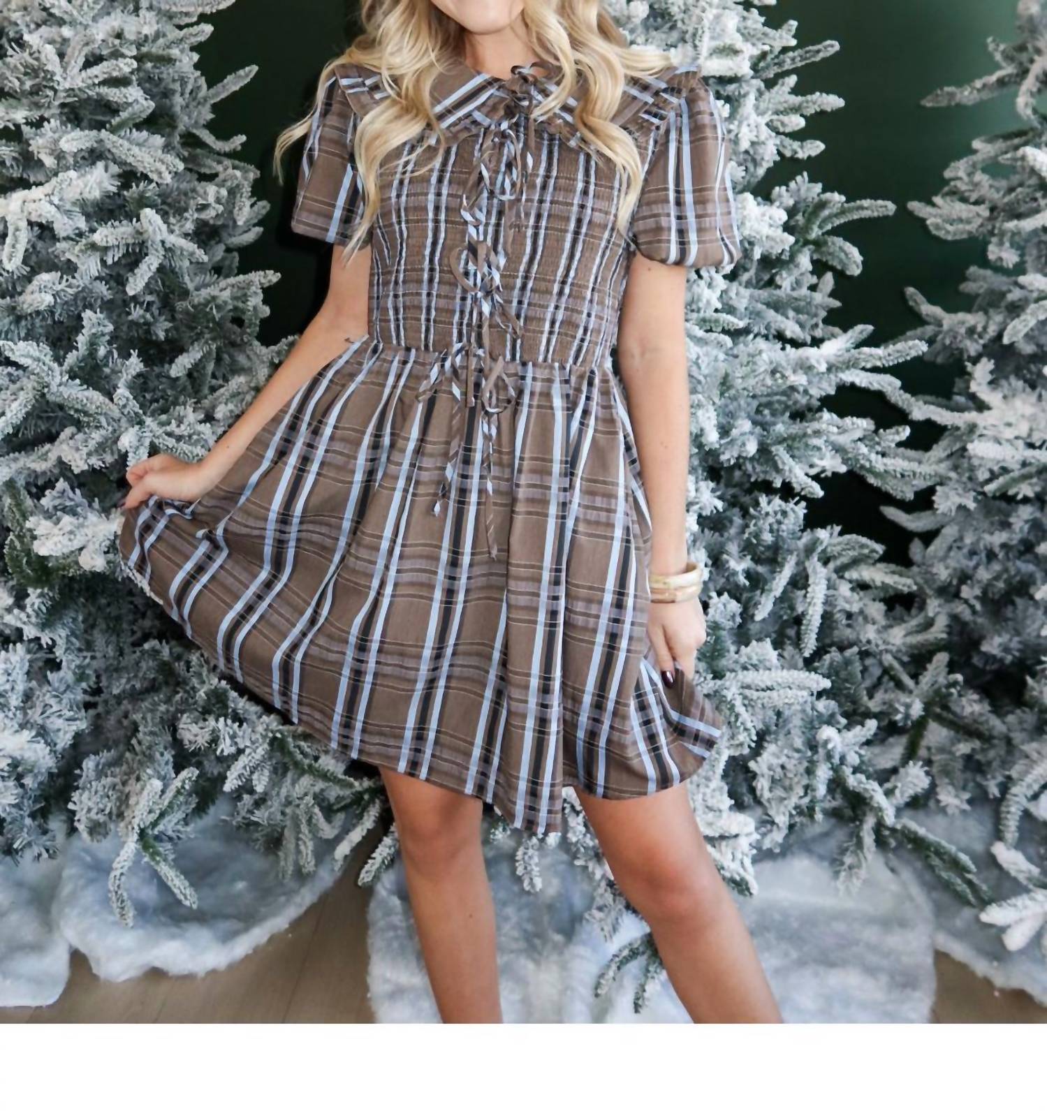 The kind of easy and flattering dress you'll be reaching for all season long. Introducing the Plaid About It Mini Dress by Aureum, a chic fit-and-flare piece in playful brown and blue plaid, perfect for your holiday party lineup. This dress features short puff sleeves and a collar neckline, complemented by a flattering smocked waist and feminine lace-up ties. Crafted from 100% lightweight polyester, it offers a mini-length silhouette measuring 35" for sizes Small and Medium. Closure: Button closure. Care: Hand wash cold, line dry, do not bleach. Model is 5'6" and wearing a size Small.