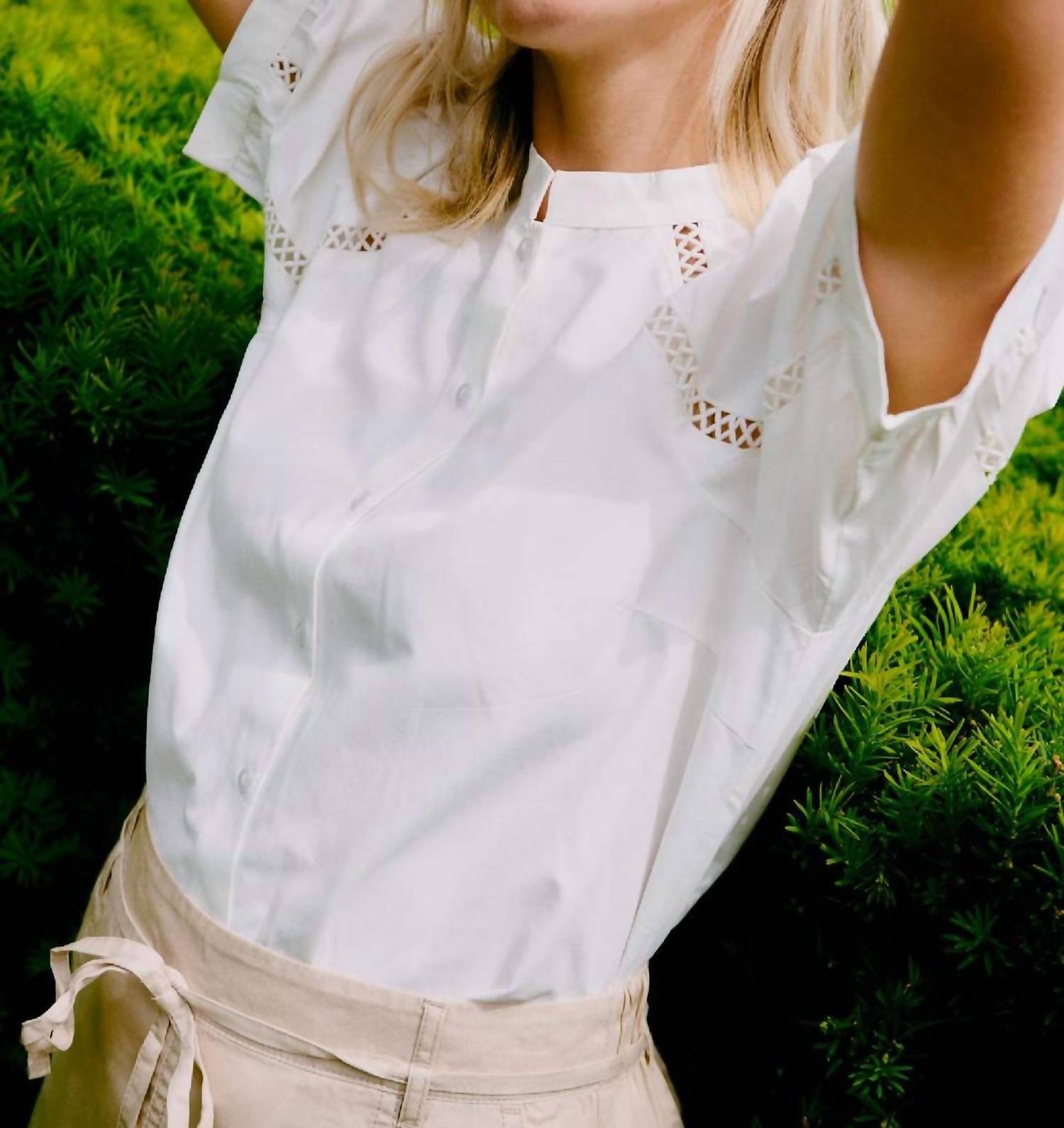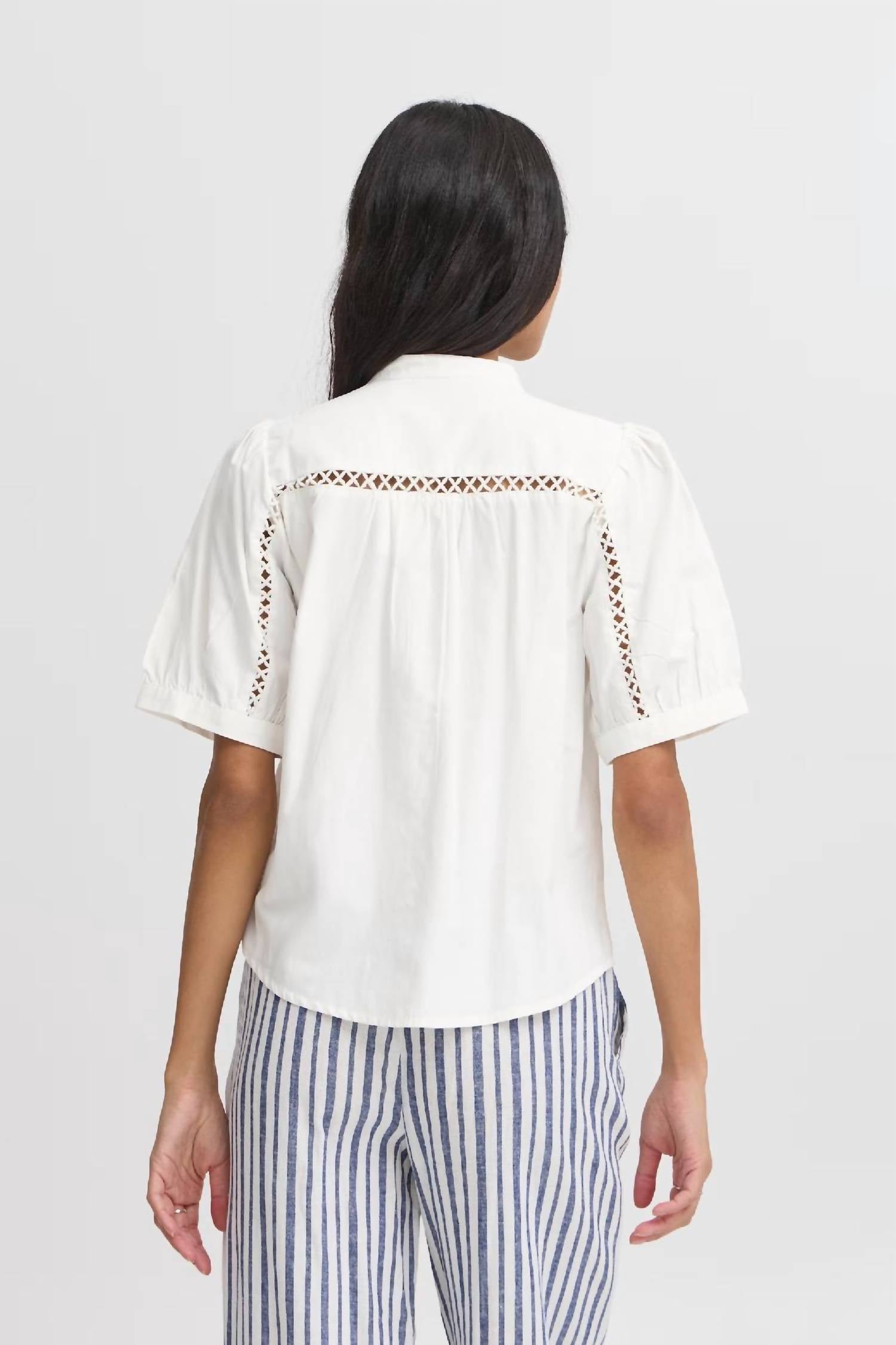 Perfectly tailored and soft to the touch. Elevate your spring wardrobe with the Frankie Shirt by b.young, a chic button-down in a pristine white hue. This women's top features elegant puff short sleeves adorned with eyelet and crochet details, and a sophisticated Mandarin style collar. Crafted from a breathable blend of 50% cotton and 50% polyester for comfort in warmer months. Closure: Button closure. Care: Hand wash cold, hang or lay to dry.