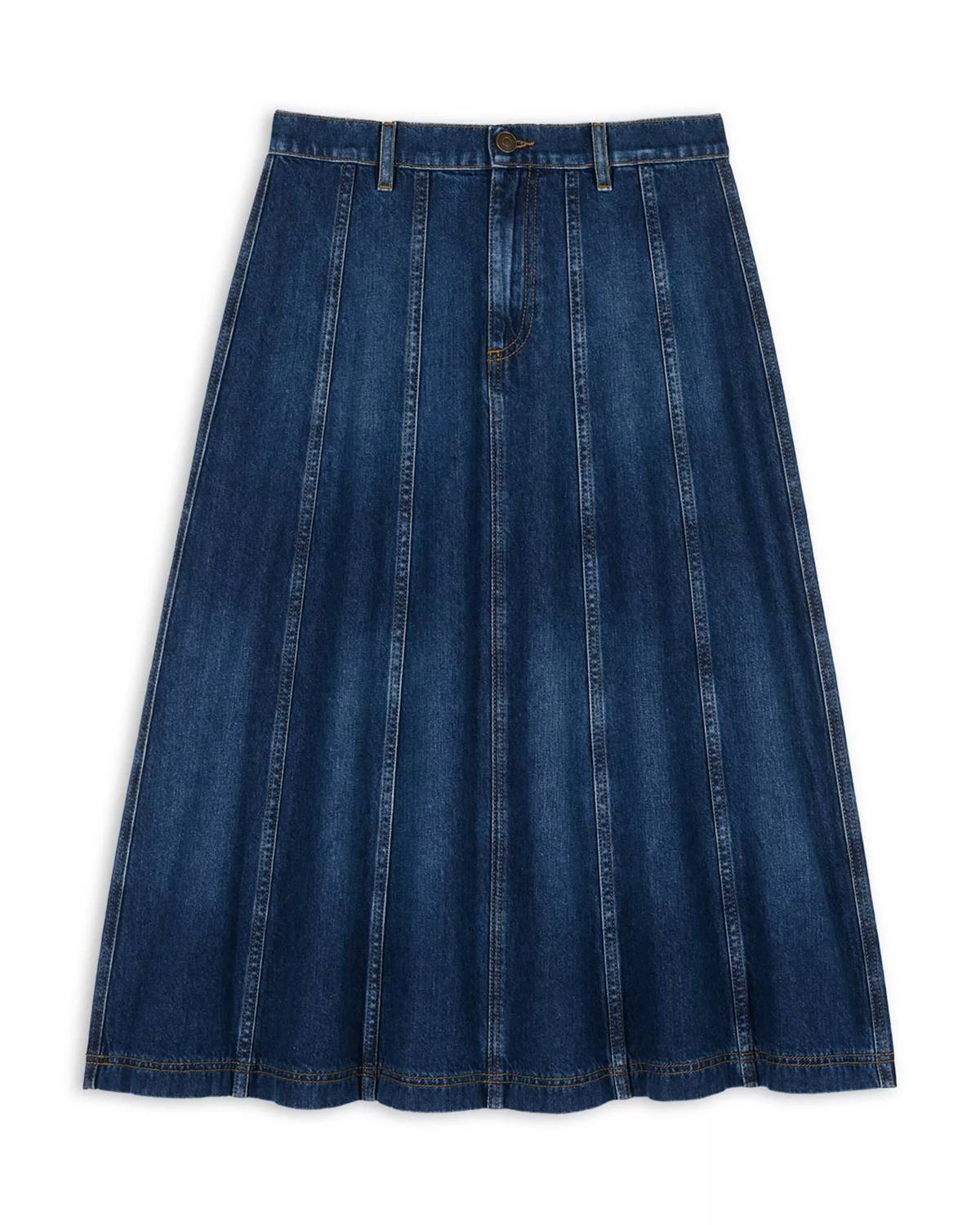 Show off just the right amount of skin in this beautifuly designed midi length skirt. The Bertille Skirt by ba&sh is a chic addition to any wardrobe, with its A-line silhouette and classic blue jeans hue. This midi skirt is crafted from 100% cotton, offering both style and comfort. It features a banded waist with belt loops, zip fly with button closure, and back patch pockets for functionality. Though the belt is not included, it fits true to size, making it an effortless piece for casual elegance. Care: Machine wash or dry clean.