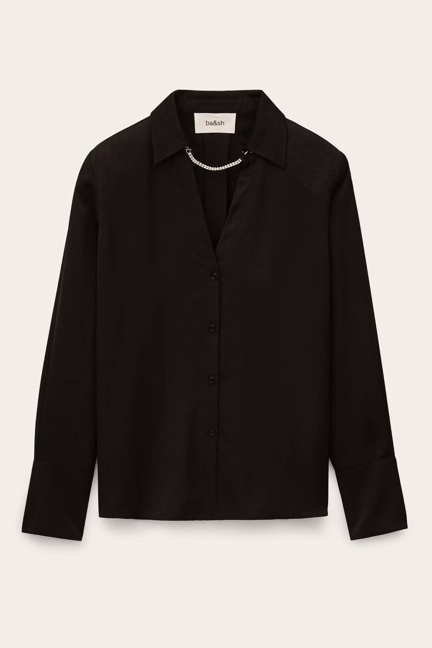 Pair this with your favorite jeans and slides for your next girls night out. Elevate your dinner party attire with the Itsey Long Sleeve Shirt by ba&sh, crafted for the minimalist in classic NOIR. This elegant blouse features a sophisticated V-neckline accented with removable neckline jewelry and is finished with wide cuffs. Made from 100% Polyester, it offers a luxurious touch and a button closure that enhances its sleek, tailored look. For care, simply hand wash and lay flat to dry, ensuring it remains a staple in your wardrobe for seasons to come.