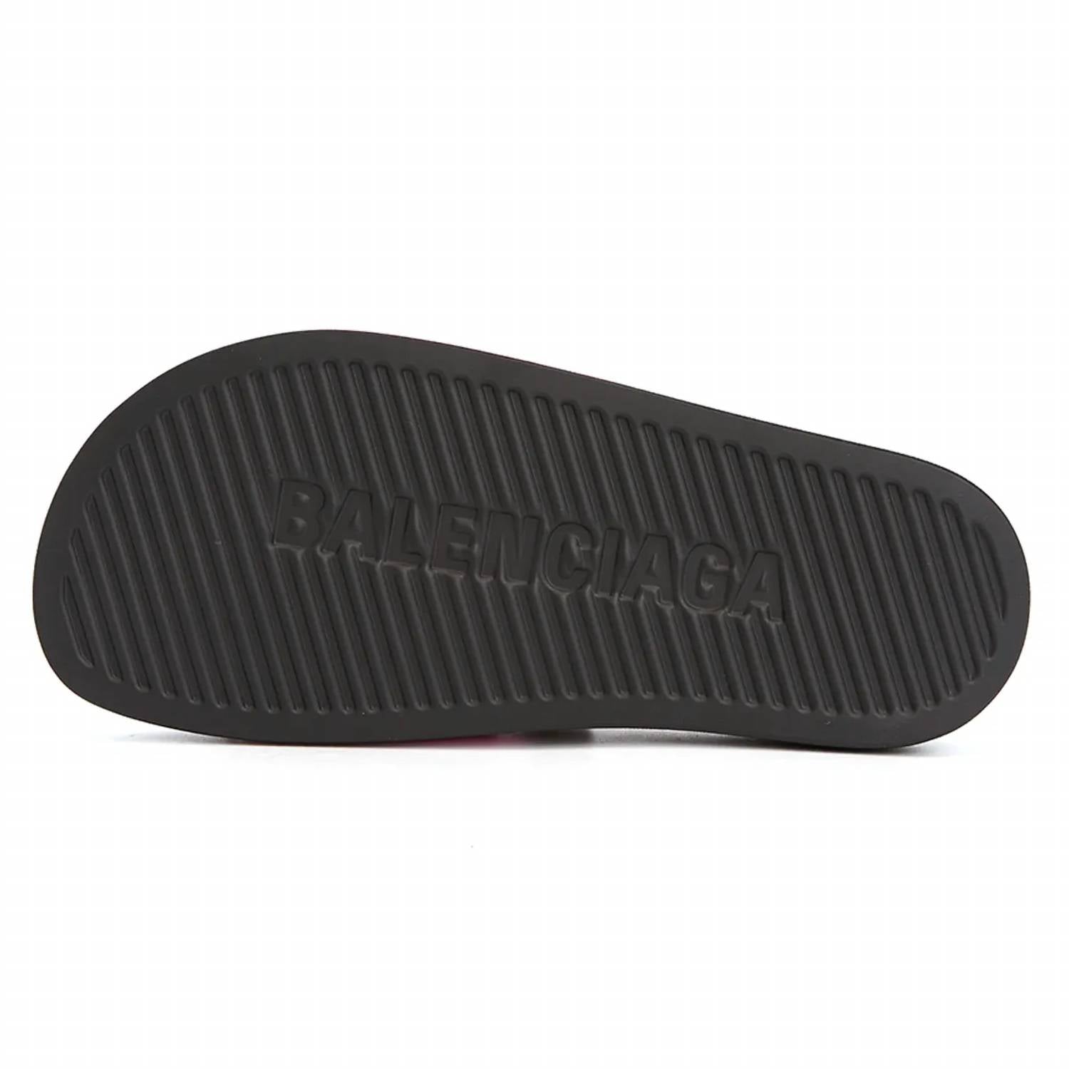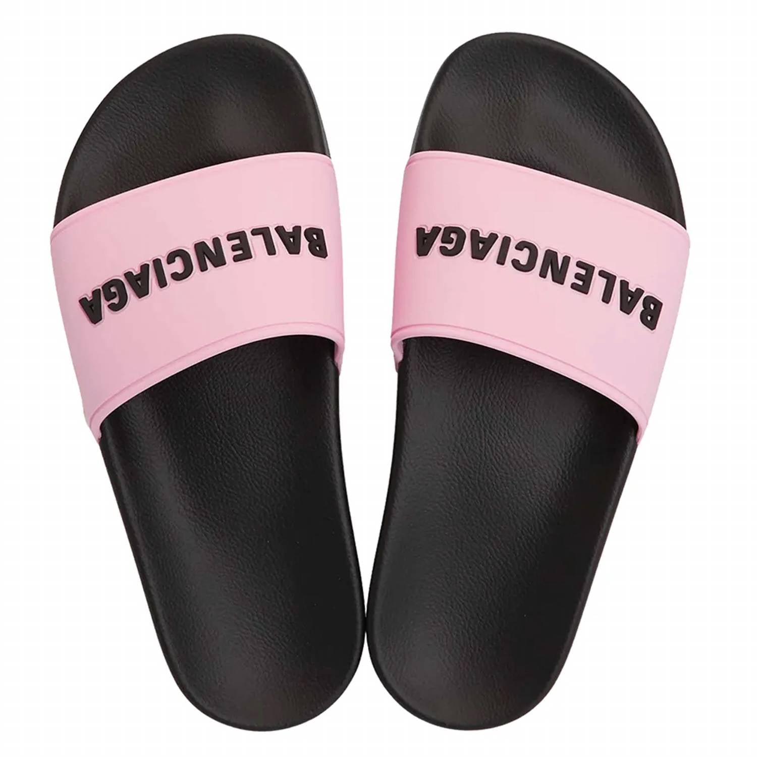 This sandal will take you from brunch to dinner and everything in between. Elevate your summer style with the Women's Pool Slides With Logo by Balenciaga, a perfect addition for travel and streetwear looks. These light pink slides feature an embossed black logo and are crafted from 100% rubber, ensuring durability and comfort. They rest on a sleek black rubber sole with a heel height of 0.59 inches and a sole height of 1.18 inches at the highest point. With an open toe design, these sandals cater to women seeking a chic, flat heel for the season.