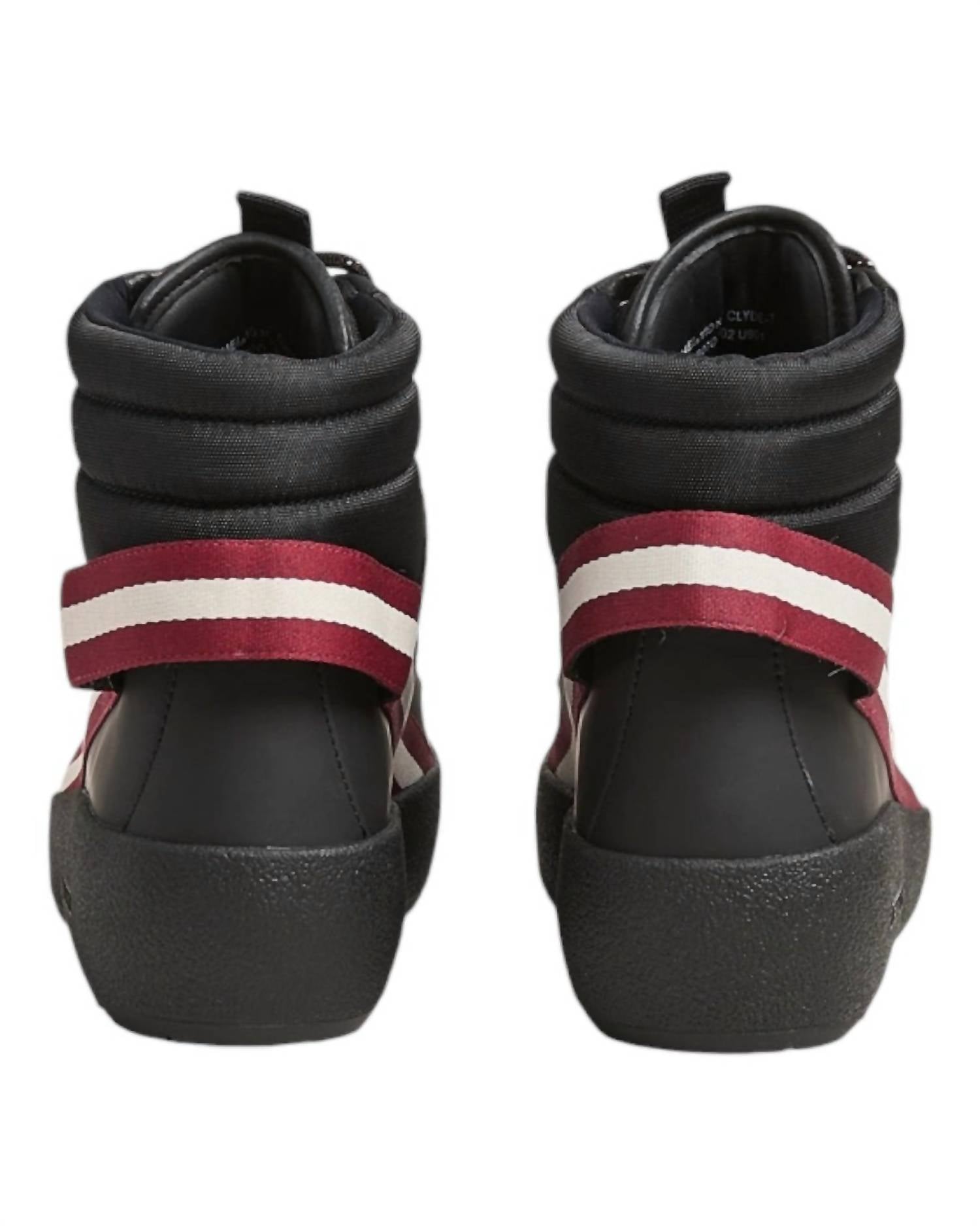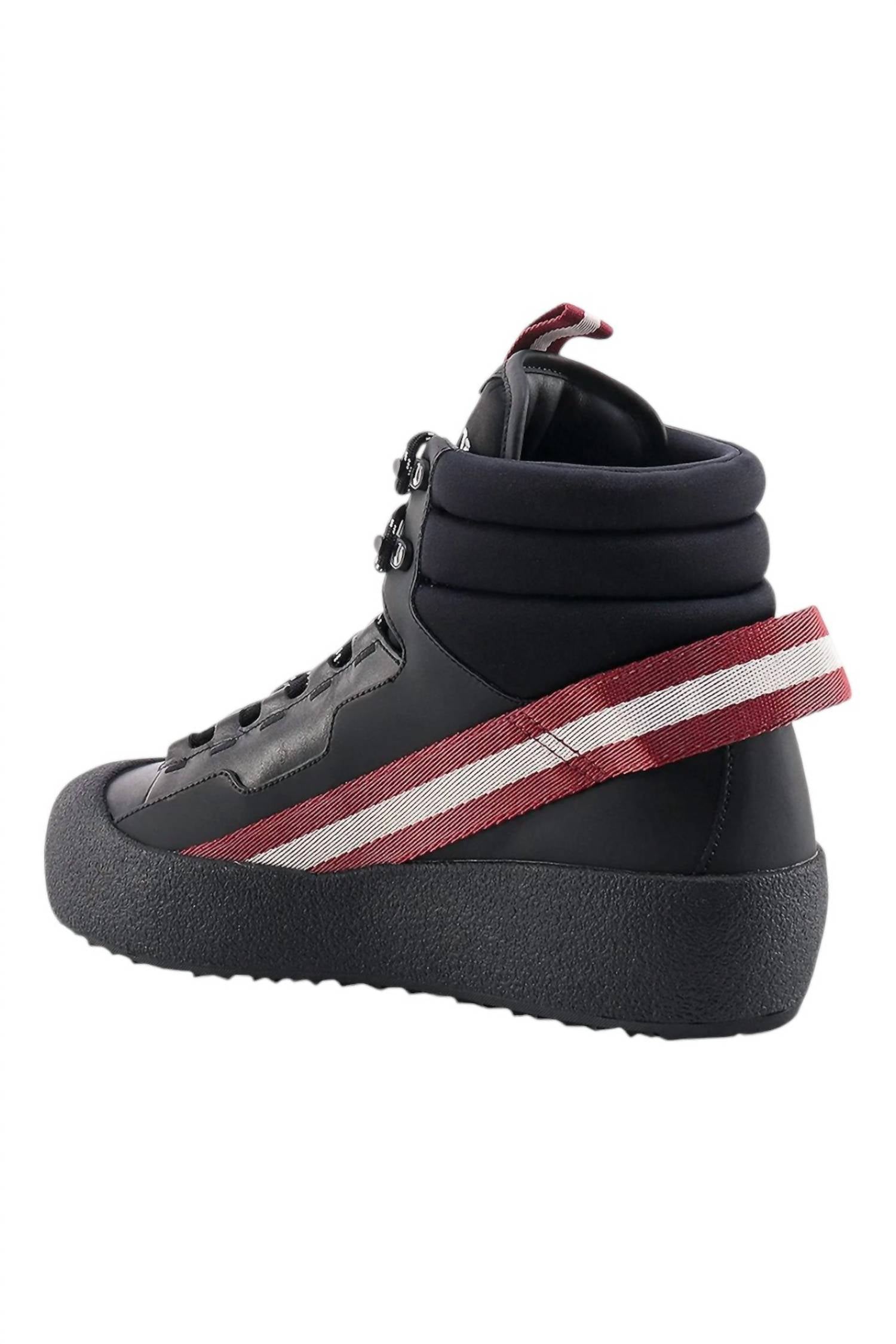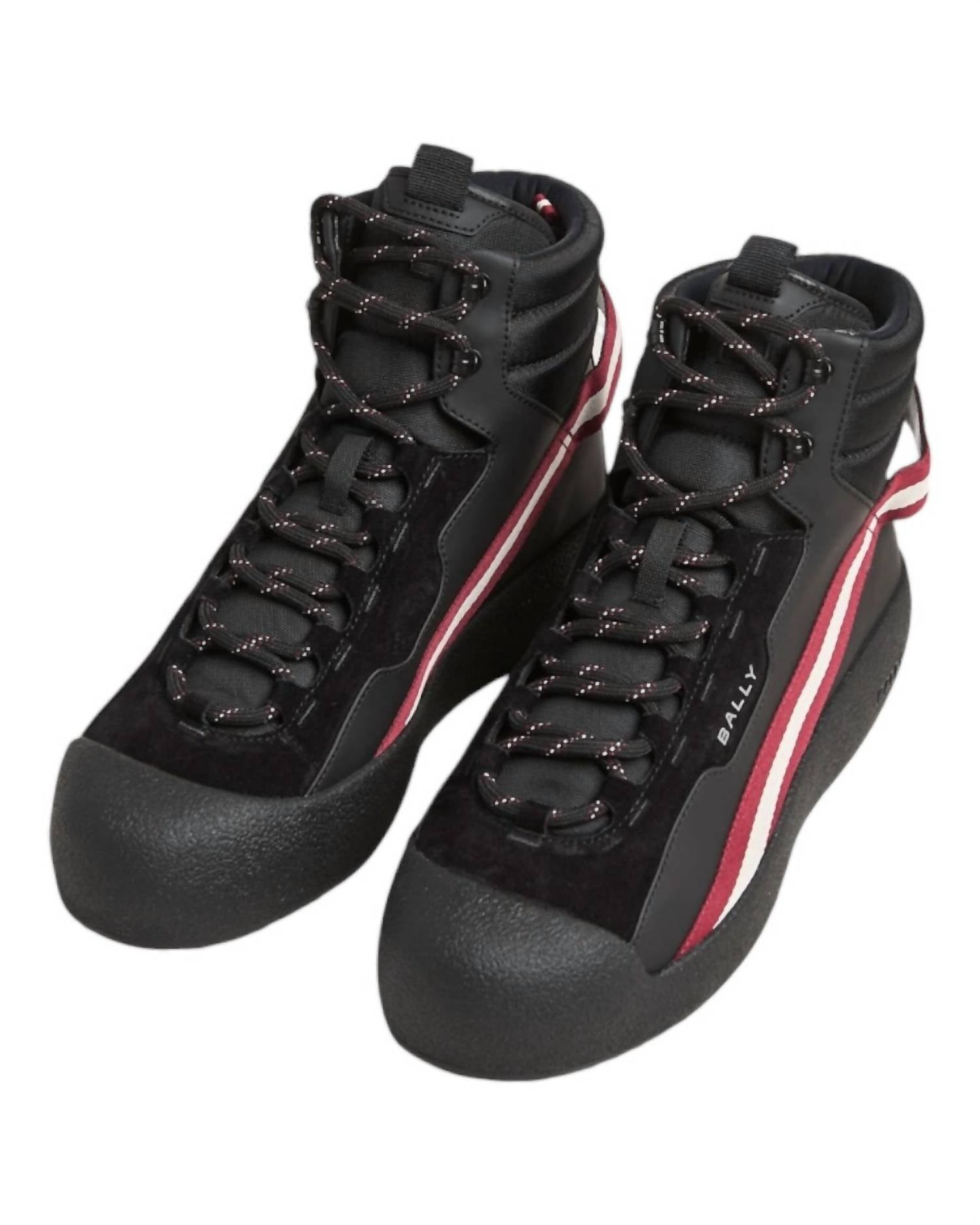 Introducing the Bally Clyde Men's Snow Boots in Black and Heritage Red, perfect for tackling cold weather while maintaining impeccable style. Crafted from leather with fabric-covered components, these boots feature a luxurious shearling lining to provide warmth. Equipped with a patterned Vibram® outsole, they offer exceptional traction, and thick fabric laces ensure a secure fit. Designed with minimalist contrast-colored stripes, they have a low (1 1/4"-2") flat heel and round toe, making them ideal for winter travel adventures.