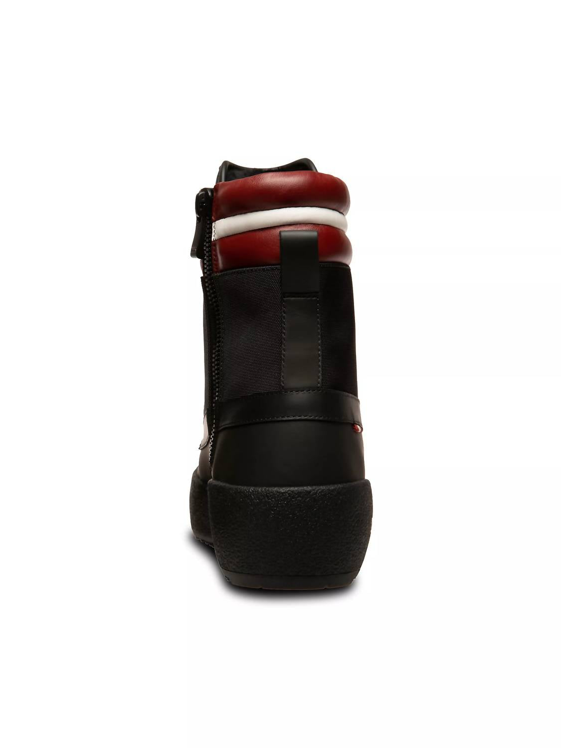 Step into winter elegance with the Bally Croker Men's Black Calf Leather Boots. These boots feature a convenient side zip and lace-up closure, offering both style and a secure fit crafted from rubber-coated leather. Stay warm with the lamb fur lining, while the padded tongue and collar enhance comfort. The Vibram® Arctic Grip sole ensures superior traction on icy surfaces, perfect for fall and Thanksgiving travel adventures.