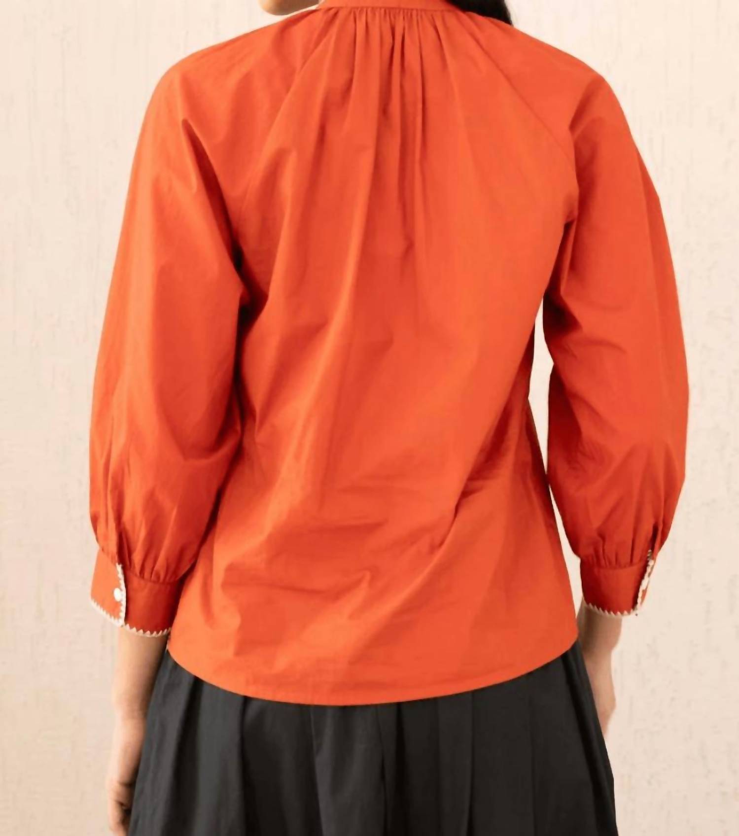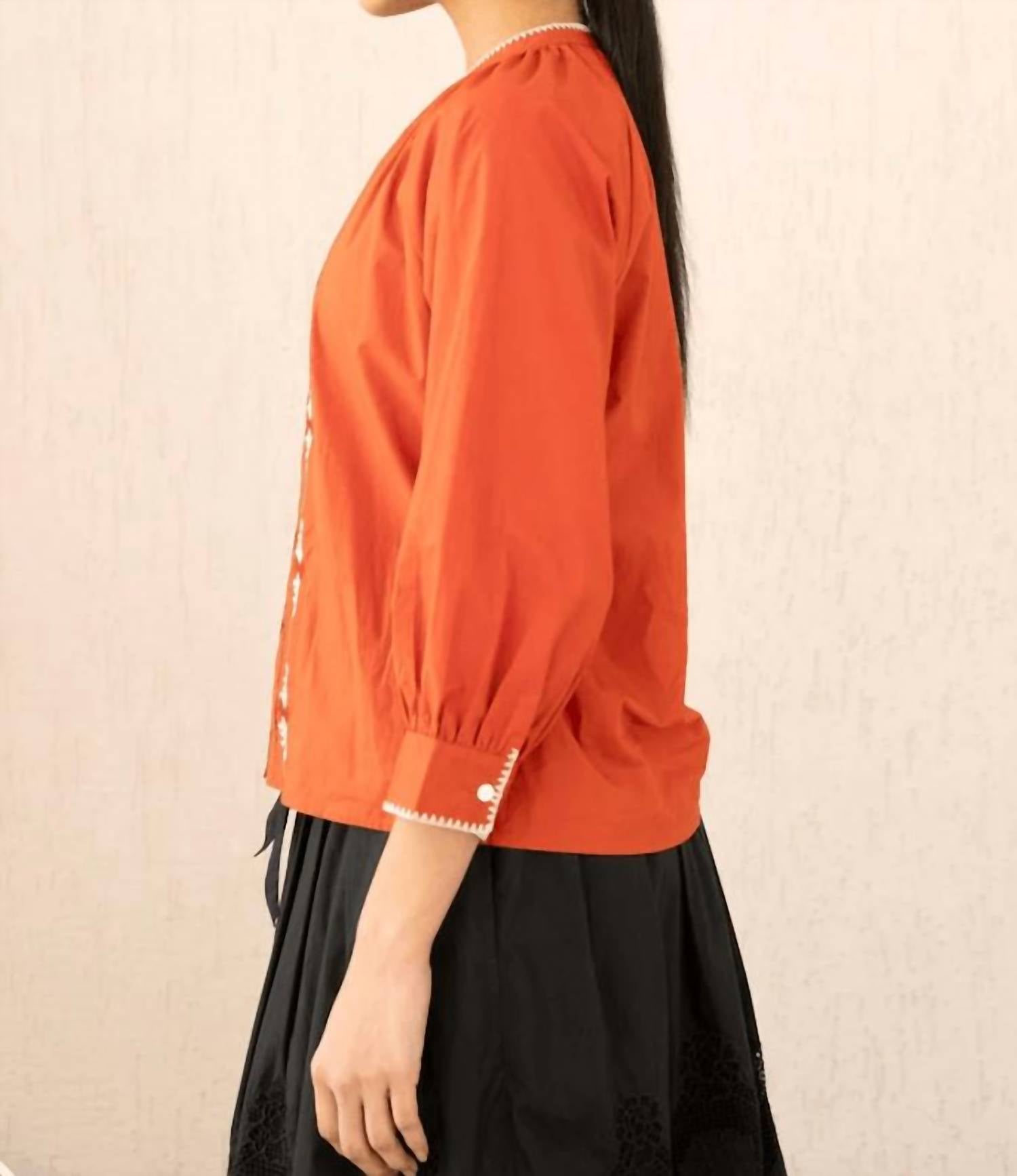 Pair this with your favorite jeans and slides for your next girls night out. Introducing the Leonie Crewneck Top by BANJANAN, a sophisticated piece in a warm Rooibos color inspired by Austrian folk art. This blouse features long sleeves with exquisitely-stitched embroidery and soft gathers for a flattering fit. Crafted from 100% Cotton Poplin and made in India, the top boasts both style and comfort with a convenient button closure. Care is simple with machine wash cold and line dry instructions.