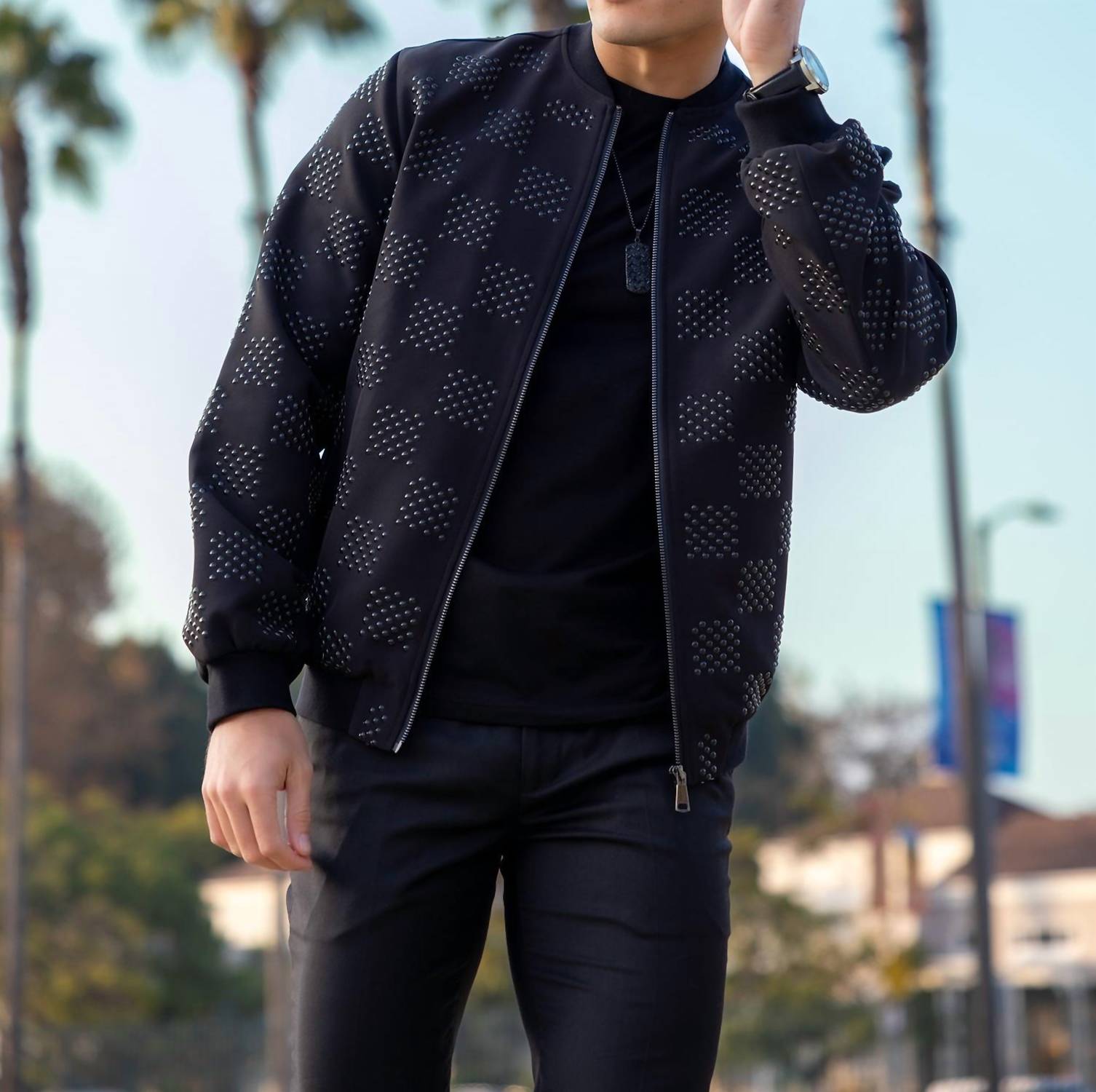 Elevate your transitional wardrobe with the Dreamstitch Bomber Jacket by BARABAS, a water-resistant piece perfect for style and comfort. This men's jacket in black features long sleeves, a checkered pattern with studs, and ribbed-knit cuffs and hem for a sleek finish. Made from 95% regenerated fiber and 5% spandex, it's lightweight yet warm. Full-zip front closure. Dry clean only.