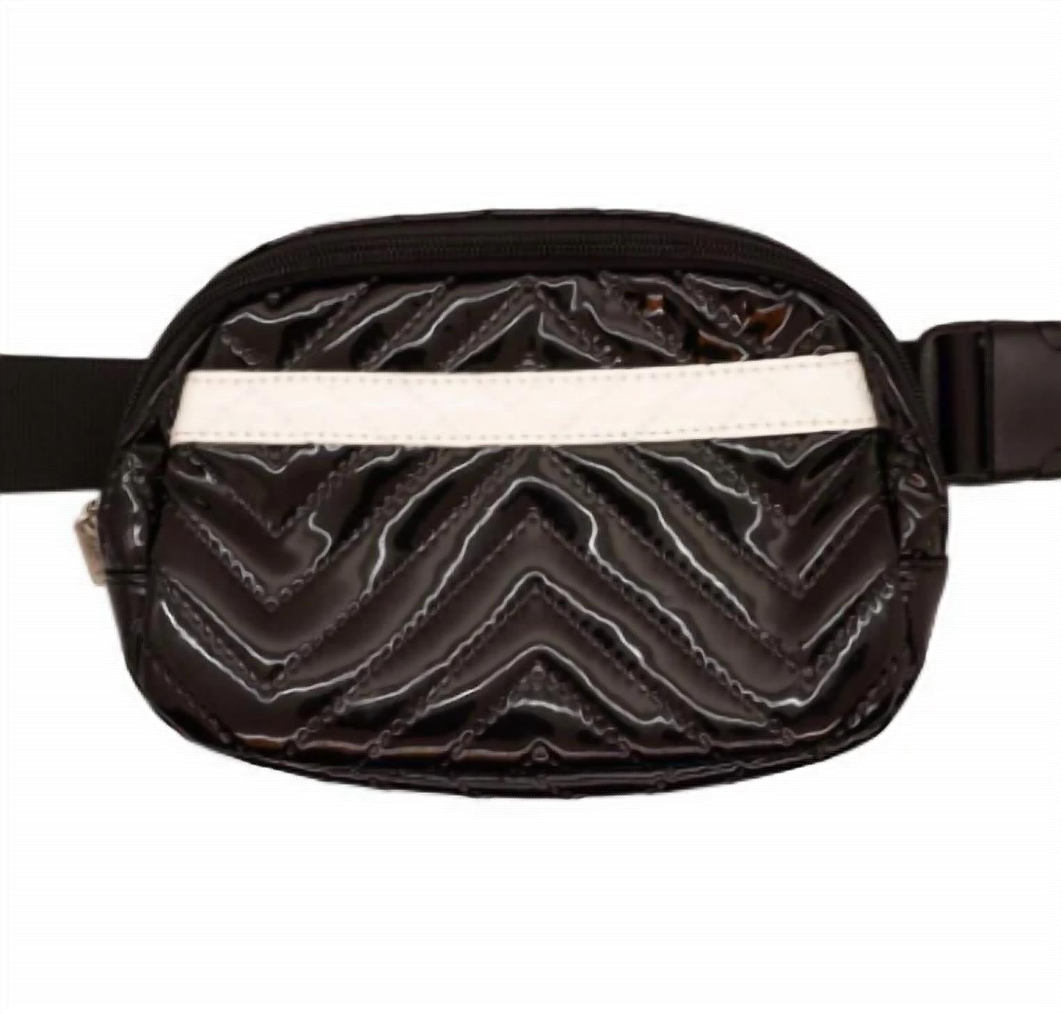 Elevate your style with the Women's Quilted Patent Waist Bag by Bari Lynn, crafted from sleek black leather for a chic and edgy look. This statement piece features an adjustable strap, ensuring a perfect fit for everyone, and is designed with both an outside zipper pocket and an inside divider to keep your essentials organized. Ideal for adding a touch of flair to any outfit, this versatile bag combines fashion with function. Make it yours for just $32.