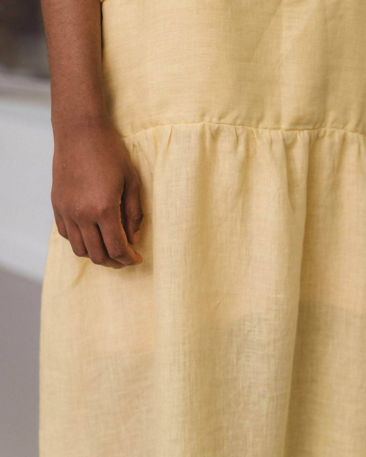 A maxi dress that is just as cute as it is comfortable. Elevate your summer wardrobe with the Garlin Dress by Baserange, a minimalist piece in a delightful ana yellow shade. This sleeveless, loose-fit maxi dress features a chic crossover V-neckline and a dropped, banded waist for an effortlessly stylish silhouette. Made from 100% linen, it's crafted in Turkey, ensuring both quality and comfort. The dress boasts a pull-on closure and is perfect for dinner parties or any warm-weather occasion. Model wears size S.