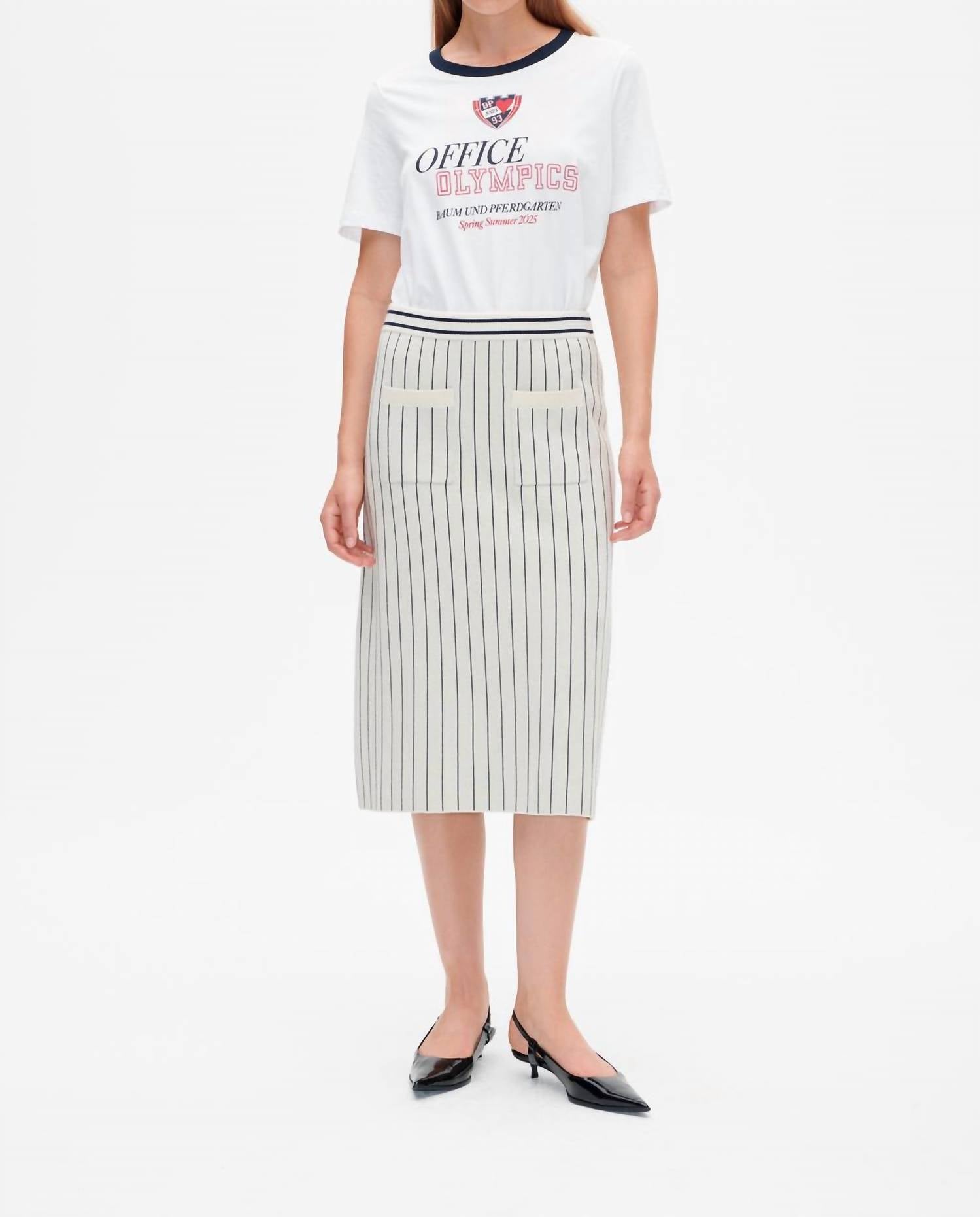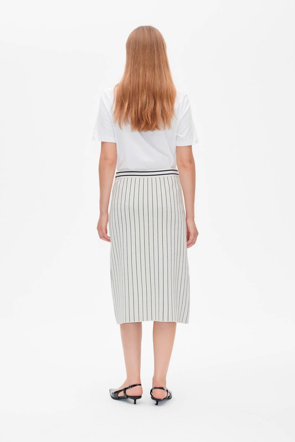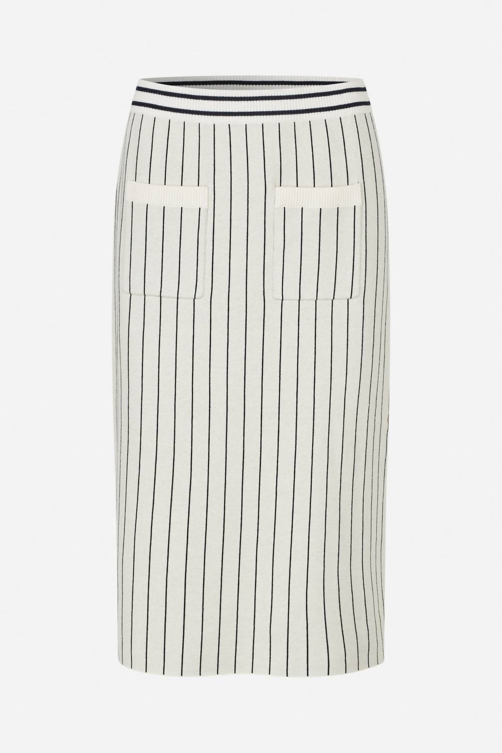 The midi length skirt is here to stay and we especially love this style. The Celie Skirt by BAUM UND PFERDGARTEN is a chic midi-length piece in a striking creme navy stripe, perfect for your spring wardrobe. Crafted from a 26% Cotton 34% Polyamide 23% Viscose 15% Polyester 2% Cashmere blend, this skirt features a straight fit with front patch pockets and an elasticated waistband for comfort and style. Closure is seamless with a convenient pull-on design. Care: Machine wash.