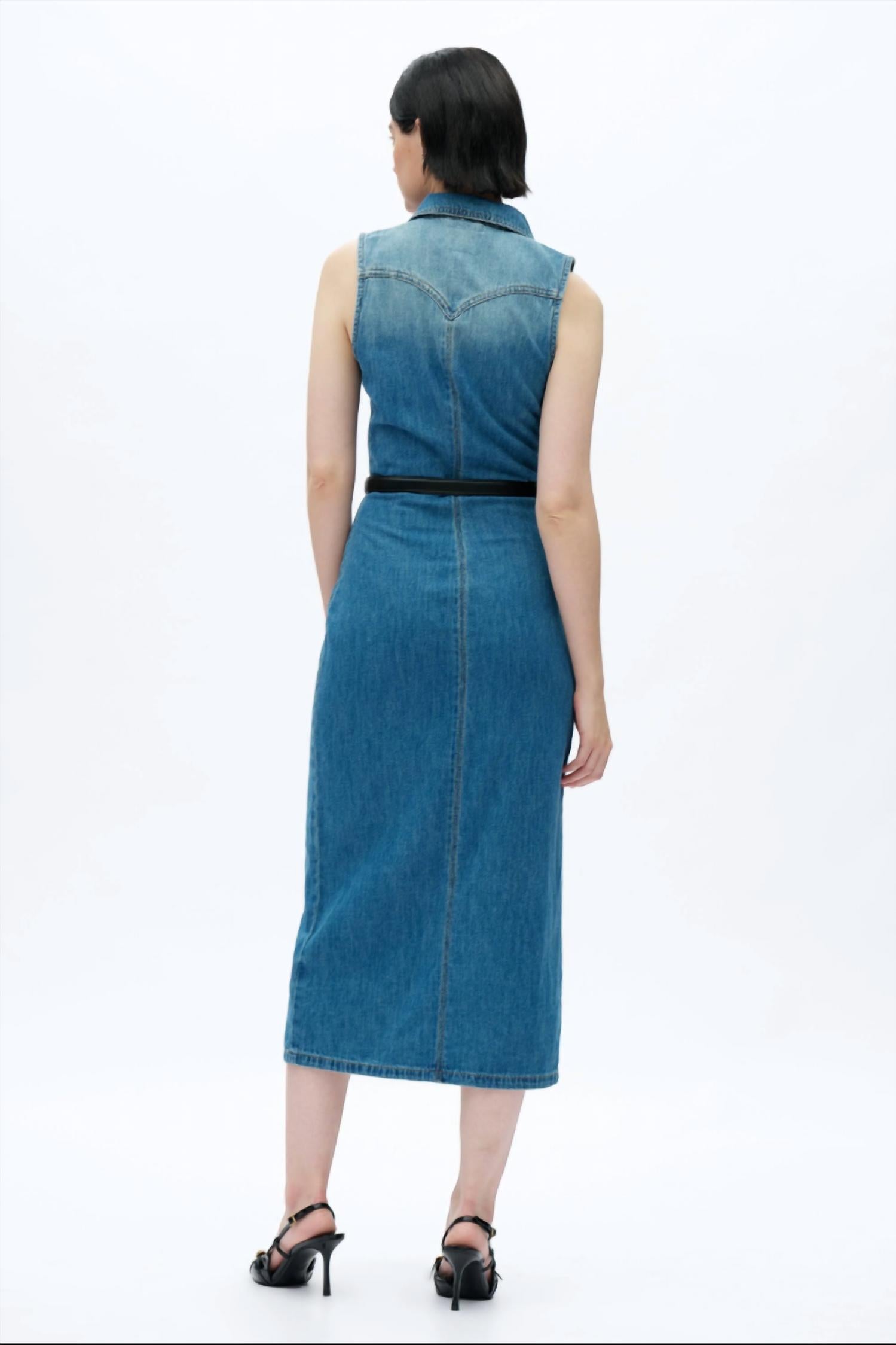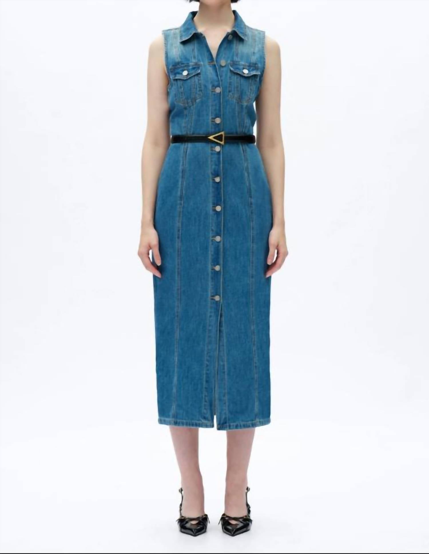 The perfect length dress does exist. Introducing the Julia Cardigan Relaxed Fit Denim Dress by Bayeas, a sleek sheath silhouette in medium blue perfect for chic, minimalist styling. This sleeveless dress is crafted from a blend of 85% cotton and 15% hemp, offering a non-stretch fabric that hugs the body beautifully. With a button front closure and practical pockets, this piece embodies effortless sophistication. Care instructions include machine wash in cold water, wash inside out, do not bleach, tumble dry low, and warm iron if needed. Model is wearing a size S (5'10" height, 31.1" bust, 24" waist, 35.6" hips).
