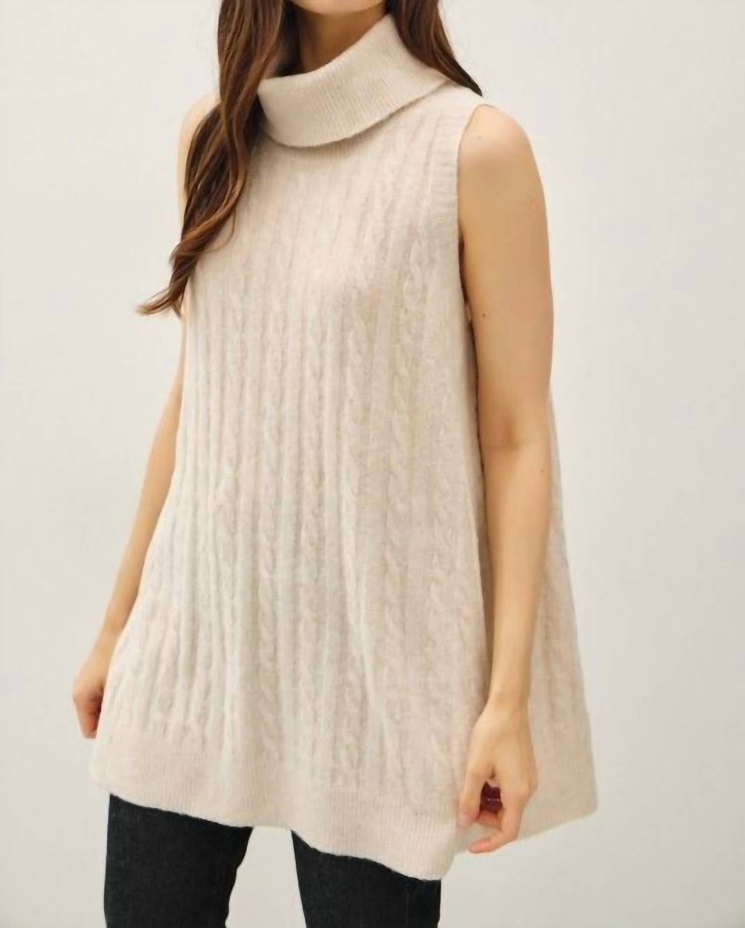 A perfect addition to any wardrobe, this classic tunic style blouse is flattering and effortless. You can easily transition from desk to dinner in this chic top. The "Meldrum Tunic" is a sleeveless, turtleneck tunic sweater with a wide ribbed knit design and a straight hem that reaches below the hip.