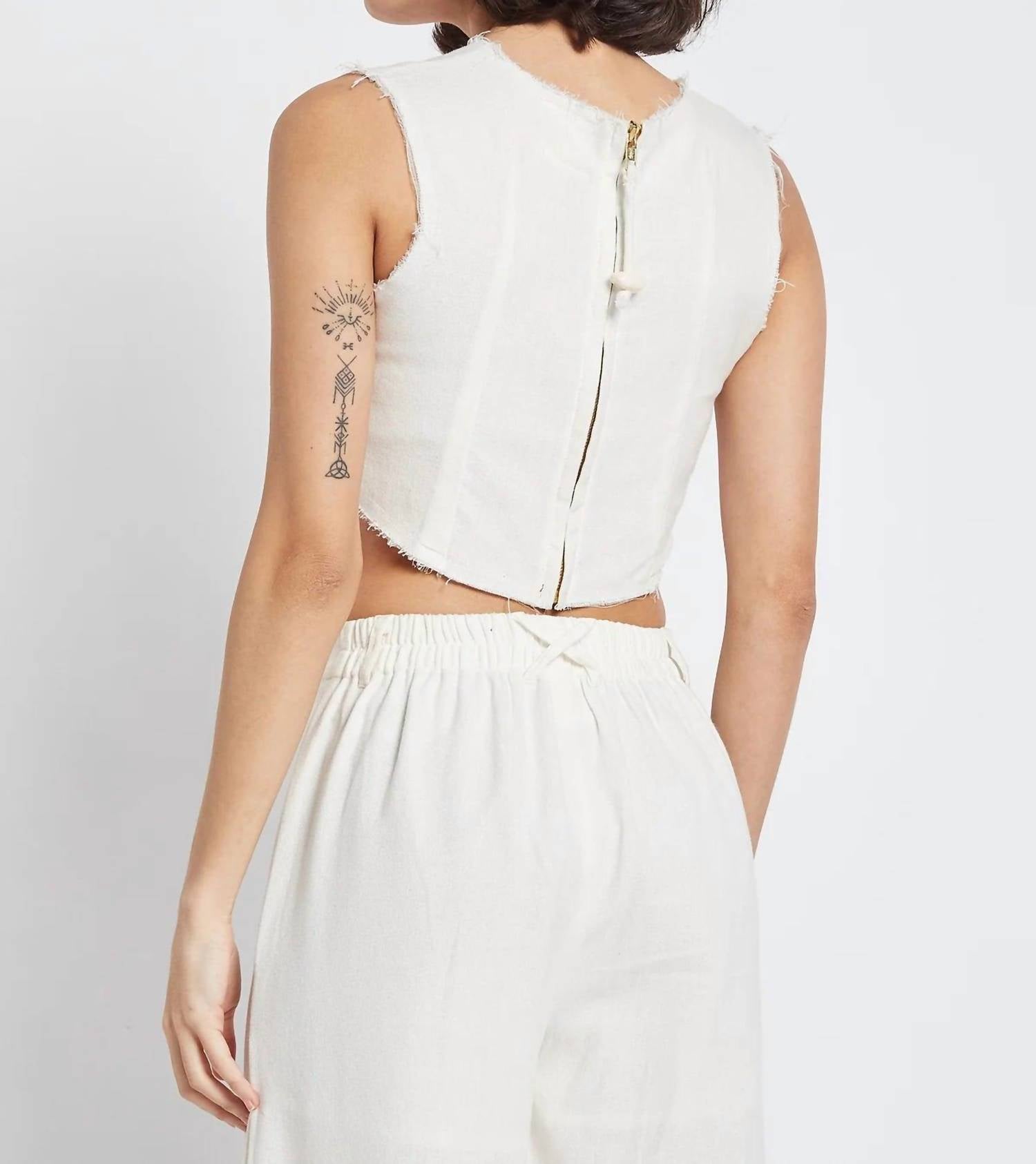 Pair this crop top with your favorite high-waisted jeans or maxi skirt. Embrace the essence of summer with the Be Sunset Surf Cropped Top, a chic addition to any vacation wardrobe. This sleeveless crop top in classic white boasts a crewneck design and is crafted from 100% cotton for ultimate comfort. Elevate your boho chic style with its graphic pattern and zip closure, perfect for sunny days and cool vibes. Care for your garment by hand washing in cold water and laying flat to dry.