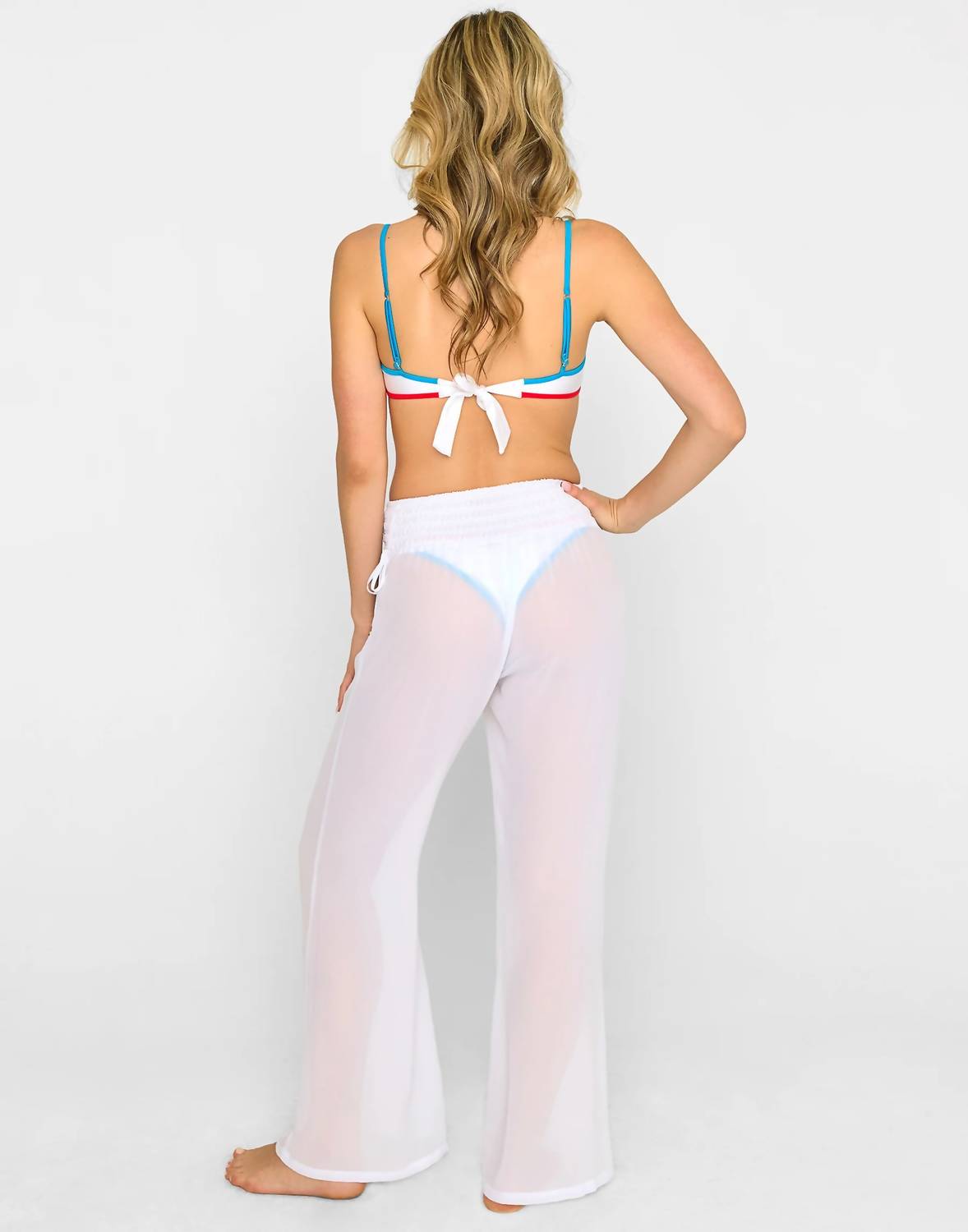Introducing the Evelyn Wide Leg Pants by Beach Bunny, an effortlessly chic option for your summer wardrobe. Crafted from 100% Polyester Georgette fabric in a solid white hue, these relaxed fit pants feature a smocked waistband with adjustable ties adorned with gold star cord ends. Designed with a pull-on closure, they offer a comfortable fit and are perfect for travel or any 4th of July celebration. Easy to care for, simply machine wash and tumble dry for continued wear. Model is wearing a size S.